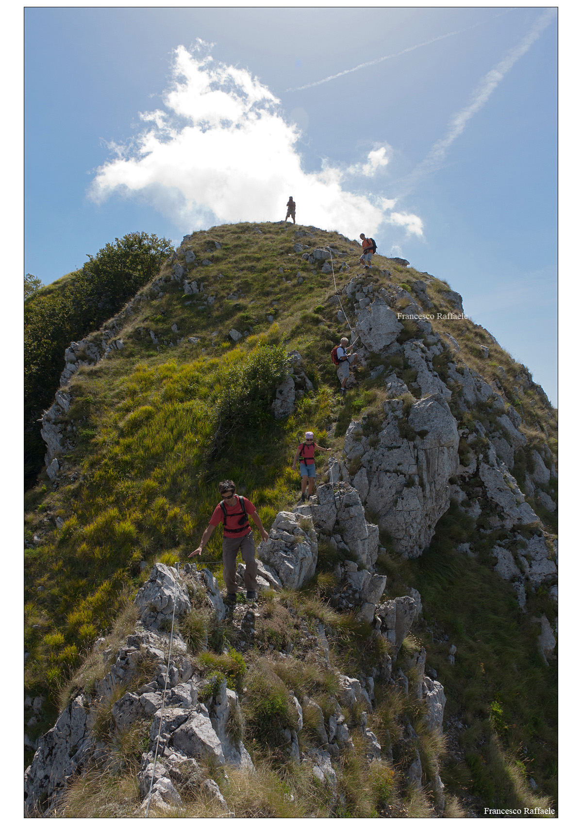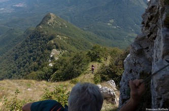 Per il resto è stata sicuramente un'esperienza stranamente nuova effettuare, per la prima volta non da solo, un giro in questo ambiente che ormai conosco così bene. Quasi tutti i compagni di escursione avevano il kit da ferrata che in questi posti può salvare la vita se si tiene conto dell'affaticamento dell'escursione e della forte esposizione di molti passaggi, peraltro mai tecnici e sempre assicurati con i cavi d'acciaio della ferrata (inaugurata 7 anni fa e manutenuta dal Cai di Salerno). |
