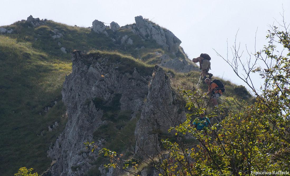 Risalendo il crinale orientale della Cresta Nord dell'Accellica. Sullo sfondo la parete NW della Pettinessa che incombe precipite sul Vallone del Ninno/Savina