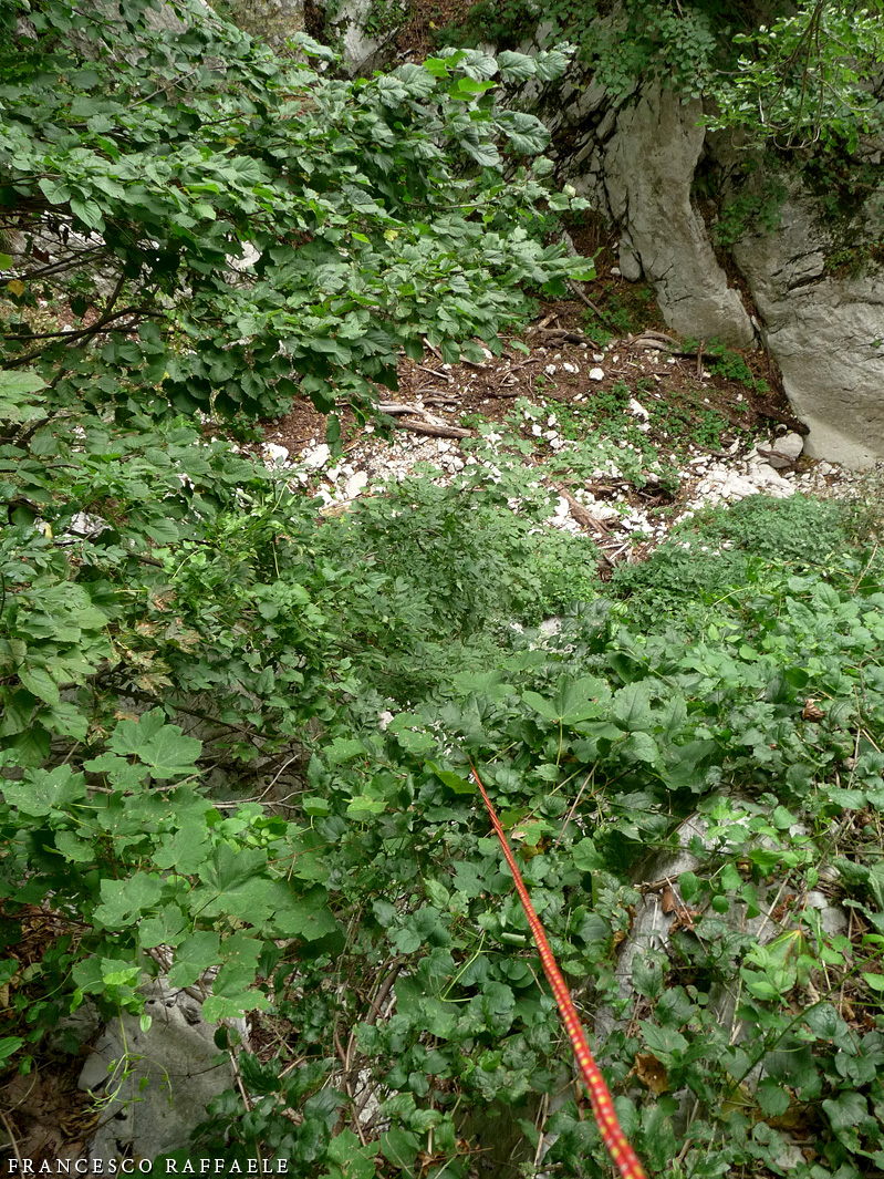 NB2: Al di sopra di questo salto, sulla sinistra (W), inizia la cengia (c. 1300m di quota) che conduce all'attacco della via alpinistica Madre Teresa di Calcutta (ripetuta il 16/8/2017 con Cristiano Iurisci).