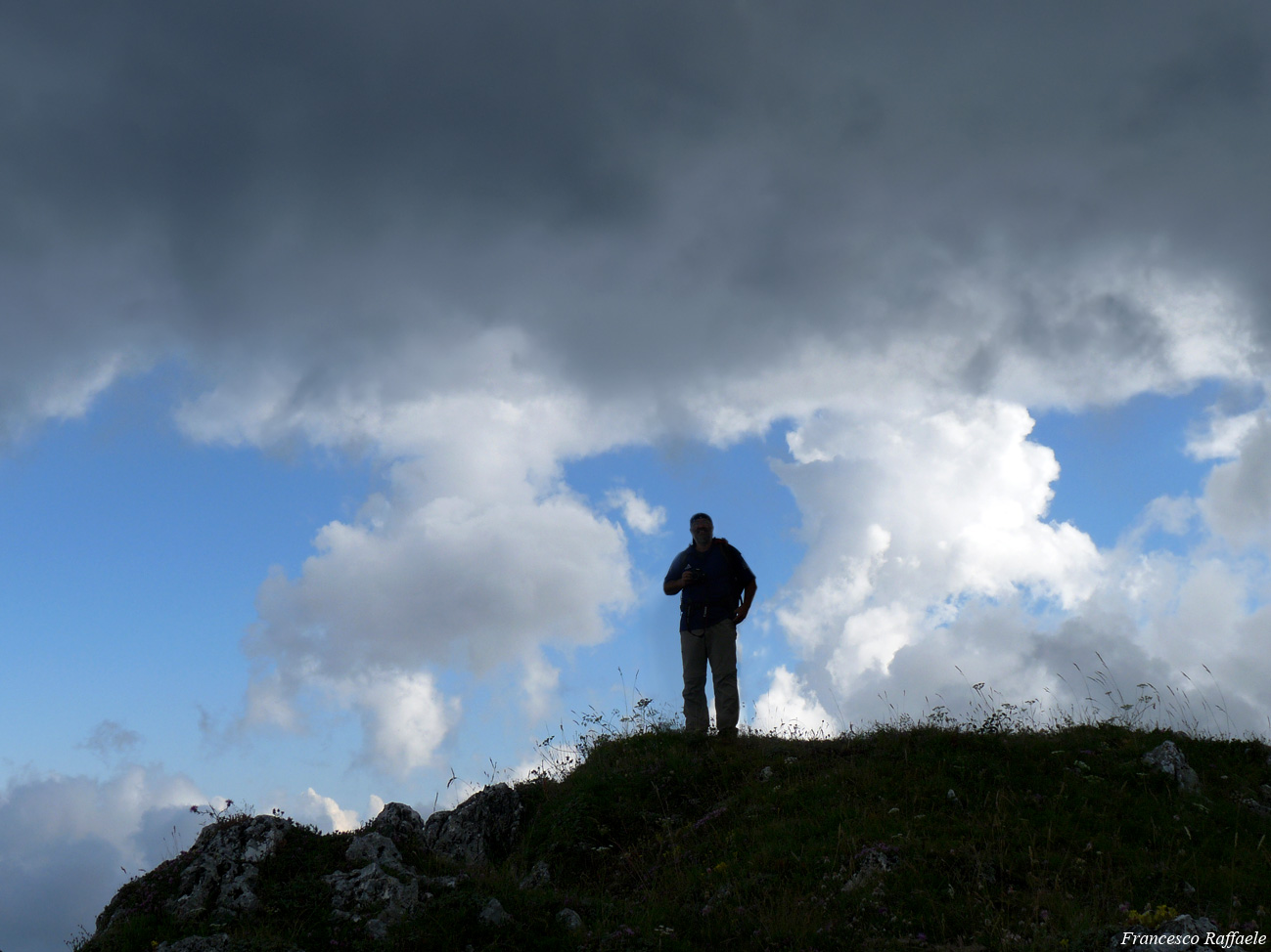 più a des, sempre tra le nuvole, la cima Costa di Amalfi (1739m) sul Piano dell'Abete e il Vallone Lacerone (alto Trigento).