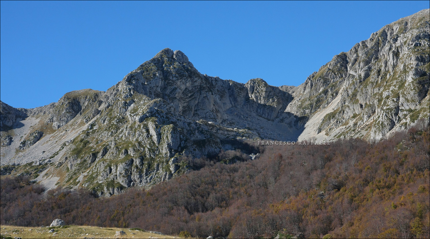 Ritorno graditissimo in questi posti affascinanti a pochi mesi dal mio passaggio in solitaria di inizio luglio (vedi links in calce). Bellissima accoglienza con i colori della faggeta della Valle dell'Inferno, vero paradiso (anche se il pieno dei colori autunnali arriverà solo pochi giorni dopo) ove ci imbattiamo in due gruppi di boscaioli, uno in salita e uno in discesa - con le bestie da soma che possono trasportare fino a 2-3 quintali di carico in legname! Lo spettacolo, una volta scavalacato il dosso morenico a Est del Lago Vivo, che in questo periodo è praticamente secco, è comunque sempre toccante, vista l'eleganza della cresta che si para dinnanzi verso occidente. Questa volta il percorso lo abbiamo effettuato in senso orario (e senza transitare per Forca Resuni e la Val di Rose, visto che dovevamo tornare all'auto al valico presso Barrea - loc. Sorgente Sambuco). I camosci del Petroso sono una colonia assai meno confidente di quella di zone come Val di Rose e Monte Amaro di Opi, dove gli individui sono ormai abituati al frequente passaggio di escursionisti. Quindi non perdo troppo tempo a fotografarli tra rocce, selle e canali delle cime di Mt. Altare - Petroso, e non cerco neanche di avvicinarli per spaventarli il meno possibile (siamo in zona di riserva integrale del parco!). La salita sul Tartaro e poi in cresta verso nord apre panorami tipici delle 'ottobrate', assai generose quanto a nitidezza dell'aria e visibilità: compaiono Ischia e le isole pontine verso il Tirreno a sud e, tra il Velino e la già bianca Majella, si profila il Gran Sasso, dalle cime occidentali sulla sinistra del Corno Grande, al roccioso Prena e al "triangolare" Camicia sulla destra. Emozionante il ritorno (mia 2a volta) sull'Innominata: stavolta, seppur in discesa, la crestina nord mi sembra meno difficile dell'altra volta tanto che i passaggi non paiono raggiungere neanche la difficoltà II- che avevo valutato nel transito verso Sud a luglio. Ho modo di credere che la quota di questa cima possa essere di circa una ventina di metri (*) superiore a quella riportata sulle IGM (2170m): è risaputo che le osservazioni possono ingannare (anche quelle riprese da E e da W, come le foto scattate da Mt. Irto e Rocca Altiera), così come i dati GPS, ma in quest'ultimo caso più rilevazioni (non mie, dato che non uso GPS) mi spingono a credere che la quota dell'Innominata (anticima Sud del Monte Petroso) possa essere di 2190m o poco più alta. Raggiunta la forcella sottostante (q. 2122, dalla quale poi decideremo di scendere) si risale infine sulla vetta del Petroso (2249m) dove pranziamo. E' una delle più panoramiche e alte della Marsica, inferiore solo a quelle del Monte Greco (2285m) e, all'interno del PNALM, alle due quote Est del Marsicano (trigon./W 2245m, E: 2252 e 2253m IGM); è di poco superiore a La Meta (2242m).