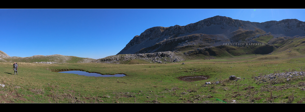 La bellissima conca glaciale dei Biscurri e La Meta, vista da N. Più dietro a sin. Metuccia, Mt. A Mare e, sullo sfondo, il Matese. A destra il Mt. Predicopeglia / Forcellone
