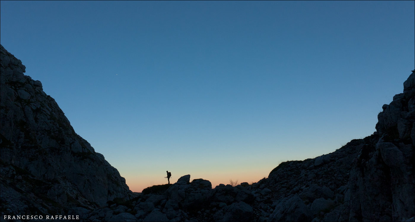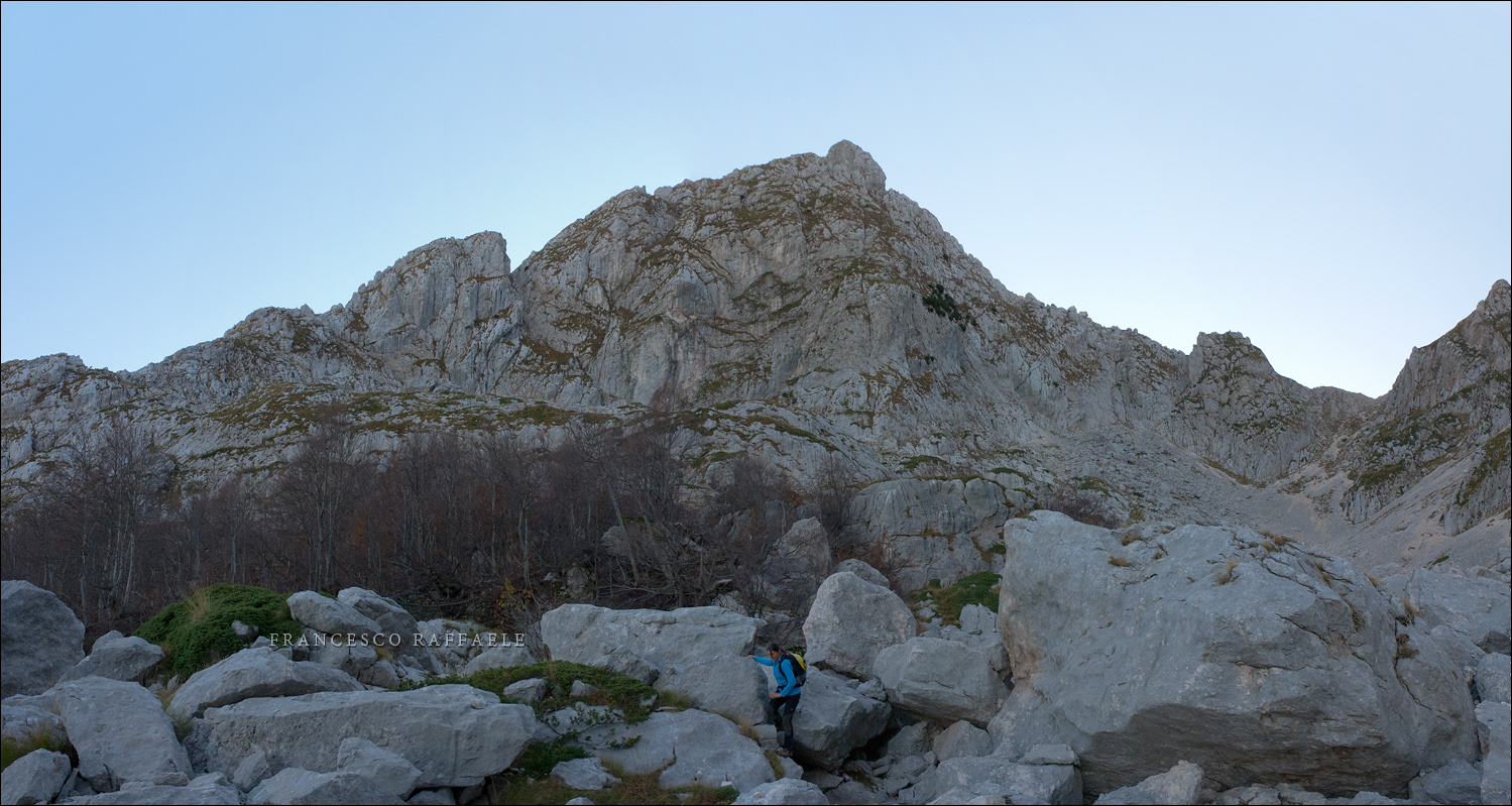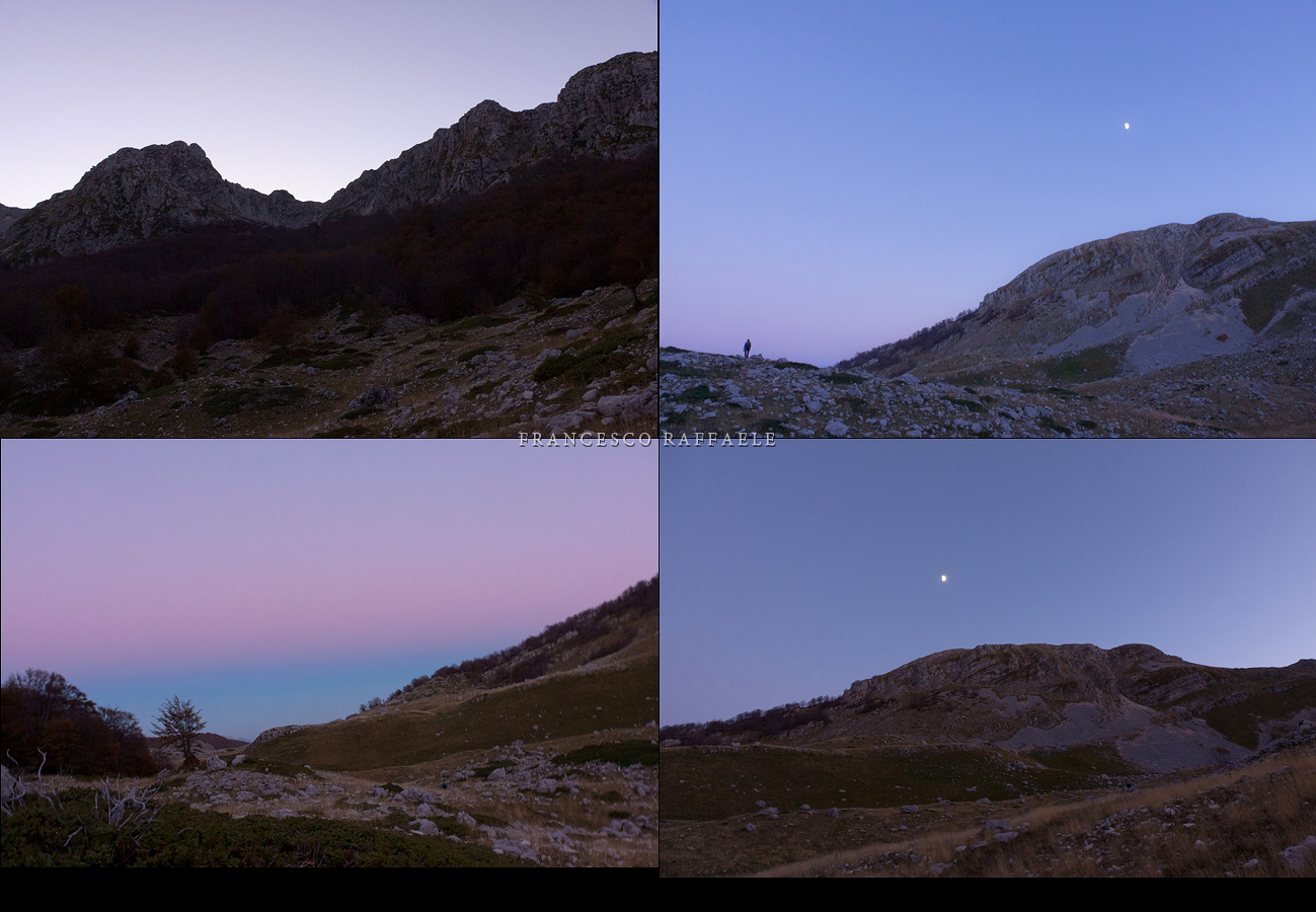 Bello anche il ritorno, nonostante l'impietosa pietraia ove tralaltro troviamo resti di lamiere arrugginite (sembrano poche e sottili per essere appartenute ad un aereo caduto nella seconda guerra mondiale -cosa di cui non ho notizia- ma non ho altre idee su cosa possano essere). Dopo le ghiaie del circo glaciale tra Innominata e Petroso ci attende un bellissimo bosco di grandi faggi, molti dalle forme sinuose, modellate dai forti accumuli di neve e dagli svalangamenti. Si prosegue con il crepuscolo che disegna alle nostre spalle le sagome inconfondibili delle cime appena percorse, il bombato Petroso e la svettante, più ardita, aguzza punta della sorella senza nome immediatamente alla sua sinistra.