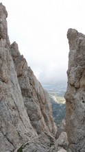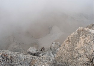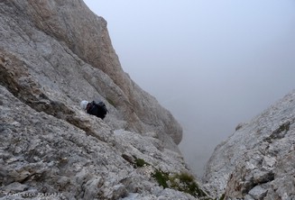La nuvola si è diradata solo in alcuni frangenti, lasciando intravedere le cime, ma comunque la visibilità era di varie decine di metri e non abbiamo avuto grossi problemi nell'individuare il percorso (bolli sul tratto E, poi nessun segno dal Terrazzone del Cambi/Madonnina fino alla cima Ov.) anche perché Massimo I. e Marco l'avevano già percorsa anni fa, e le relazioni sono precise (oltre al fatto che sulle pareti si individuano i punti di ancoraggio per le calate e per eventuali aggiramenti, come quello delicato nel finale, sulla roccia marcia del filo di cresta poco a E della Cima Occid.).