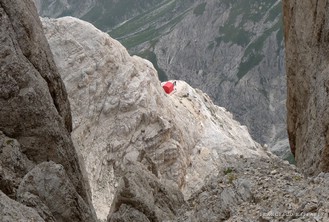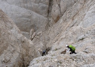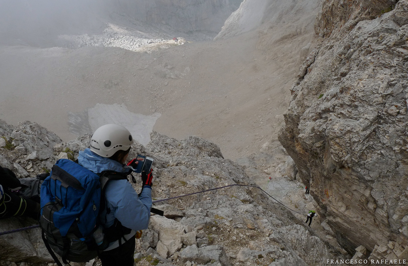 Ovviamente si risparmia qualche ora pernottando al Rifugio Carlo Franchetti (2433m), v. links sotto. [La prima traversata invernale di questa via fu compiuta da F. Cravino e F. Duprè, 19/3/1957, da E a O in 12 ore. Dato lo sviluppo della via, i tratti aerei e i passaggi di disarrampicata, esposti o angusti, in condiz. invernale le difficoltà aumentano sensibilmente (D ?) ed è possibile che si renda necessario un bivacco notturno].