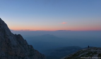Un piacere trovare la cima del Corno Grande completamente desolata (!) - è la prima volta che mi capita- anche se fino a pochi minuti prima del nostro arrivo c'era ancora qualcuno. Ci aspetta solo un cane, che non ne ha voluto proprio sapere di tornarsene giù con noi (probabilmente l'avrà fatto il giorno successivo, perché mi dicono che domenica pomeriggio non era più lì). Dopo una breve sosta torniamo giù per cresta N, Passo dl Cannone e Sella dei Due Corni, dove la Natura ci restituisce un po' di ciò che, con le nubi, ci aveva tolto tra le cime: un diffuso giallore sulle Fiamme di Pietra del Corno Piccolo e poi alcuni minuti di pennellate rosa-arancio sul Lago di Campotosto. Ripassiamo per il Rifugio Franchetti (19:30) e quindi giù nel Vallone delle Cornacchie, alla luce delle frontali, per i prati dell'Arapietra e infine all'auto (21:10). In tutto 11 ore e mezza di 'grande montagna', come si suol dire...