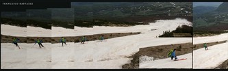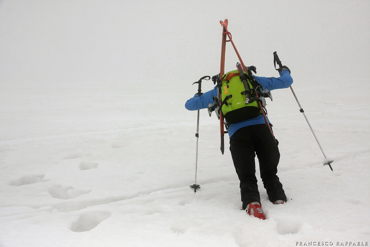 Prima che la neve si sciolga si deve tornare sulla Majella. Il versante occidentale non è spettacolare come quello opposto, dato che, ad eccezione della stupenda Valle dell' Orfento a NW, mancano valloni profondi, ma il Monte Amaro è sempre una cima ambitissima. L'idea iniziale di un anello Rava del Ferro - Cima - Rava della Giumenta Bianca, va a farsi benedire quando, giunti il venerdì sera, veniamo a conoscenza di alcune frane sulla strada Campo di Giove - Passo S. Leonardo che hanno spaccato il piano stradale impedendo (o rendendo pericoloso) il passaggio dei mezzi pesanti. Il giorno successivo la Majella è totalmente coperta! Ma vista la trasferta lunghetta (3h e mezzo), non possiamo rimandare a domenica (che invece sarà una giornata tersa) e iniziamo la marcia da Campo di Giove verso il Fondo di Majella e quindi, dalla Forchetta, sulla cresta W della lunga Valle di Femmina Morta. Il crinale della muraglia a S del Monte Amaro è ben spazzato dal vento, poca neve. La situazione cambia solo sugli ultimi 200m di dislivello, quando risaliamo la gobba sommitale, dal versante SW (visto che non siamo sul classico sentiero che passa per il Mt. Macellaro - Grotta Canosa - Tre Gradini) dove si affonda nella "marmellata". La cima è desolata, il solito vento forte: ci ripariamo una mezz'oretta nel Bivacco Pelino, e dopo il pranzetto/merenda ci avviamo a scendere per la Direttissima ancora tra fitte nubi e -in alto- nella neve-pappa! A metà dell'ampio canalone, finalmente sotto la quota nuvole, si para dinnanzi il Morrone. Ritorno in notturna, 13h e 45'. |