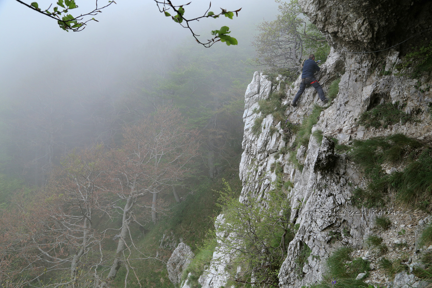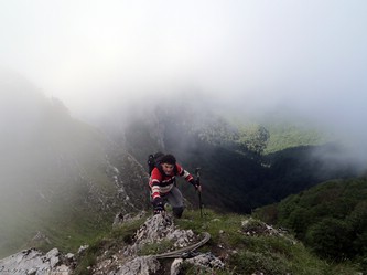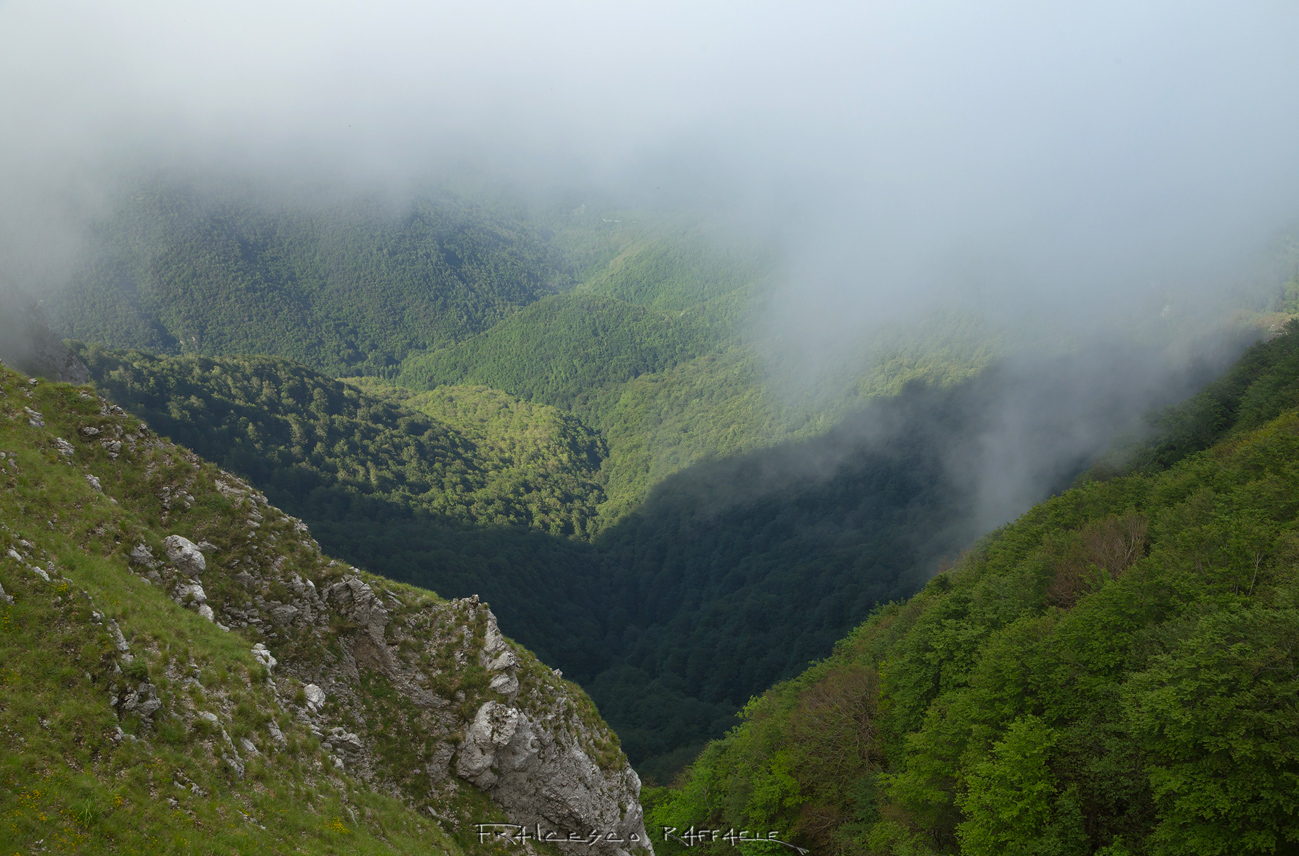Salita dai Piani di Giffoni al Butto della Neve, Tracciolino del Ninno, Varco del Paradiso, Ninno (breve sosta) e Cima Sud (evitiamo di salire anche alla Nord per la fitta nuvolosità e per paura del sopraggiungere dei fumini). Abbiamo atteso un'oretta sulla Pettinessa NE per aspettare che le nuvole si diradassero dal Varco del Paradiso: per alcuni attimi si vede la cima Nord e, inizialmente, la massa di nubi appoggiata alla sua parete meridionale fa apparire la Celica come se fosse un grande campanile alto e isolato. Poi le nubi cominciano a diradarsi, transitando velocemente nel Varco del Paradiso. Dopo una breve sosta alla Cima Sud, percorriamo la Cresta fino al Timpone, quindi scendiamo per il Varco di Acquafredda e la Veda d'a Mola ritornando alla Caserma Forestale dei Piani di Giffoni. Anello effettuato con Elio Dattero e Michele di Gennaro, bravi appenninisti (e Dolomitisti!) alla loro prima esperienza sull'Accellica. |