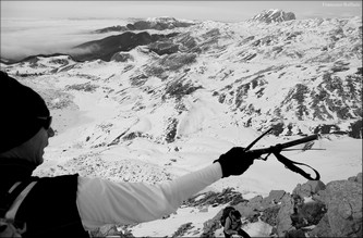 Mt. Cavallo, apofisi N (q. 1920); s'intravede il canale Nord (a des. della mia firma) da dove siamo saliti (Massimo è già partito verso l'attacco)