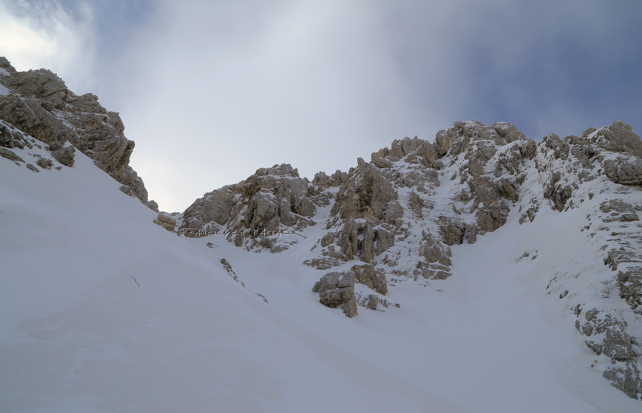La mancanza di protezioni, il passo ripido e soprattutto il ghiaccio troppo duro per le normali piccozze da escursionismo, mi costringeranno a un breve ma lento e non facile dietro-front