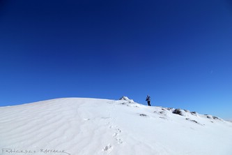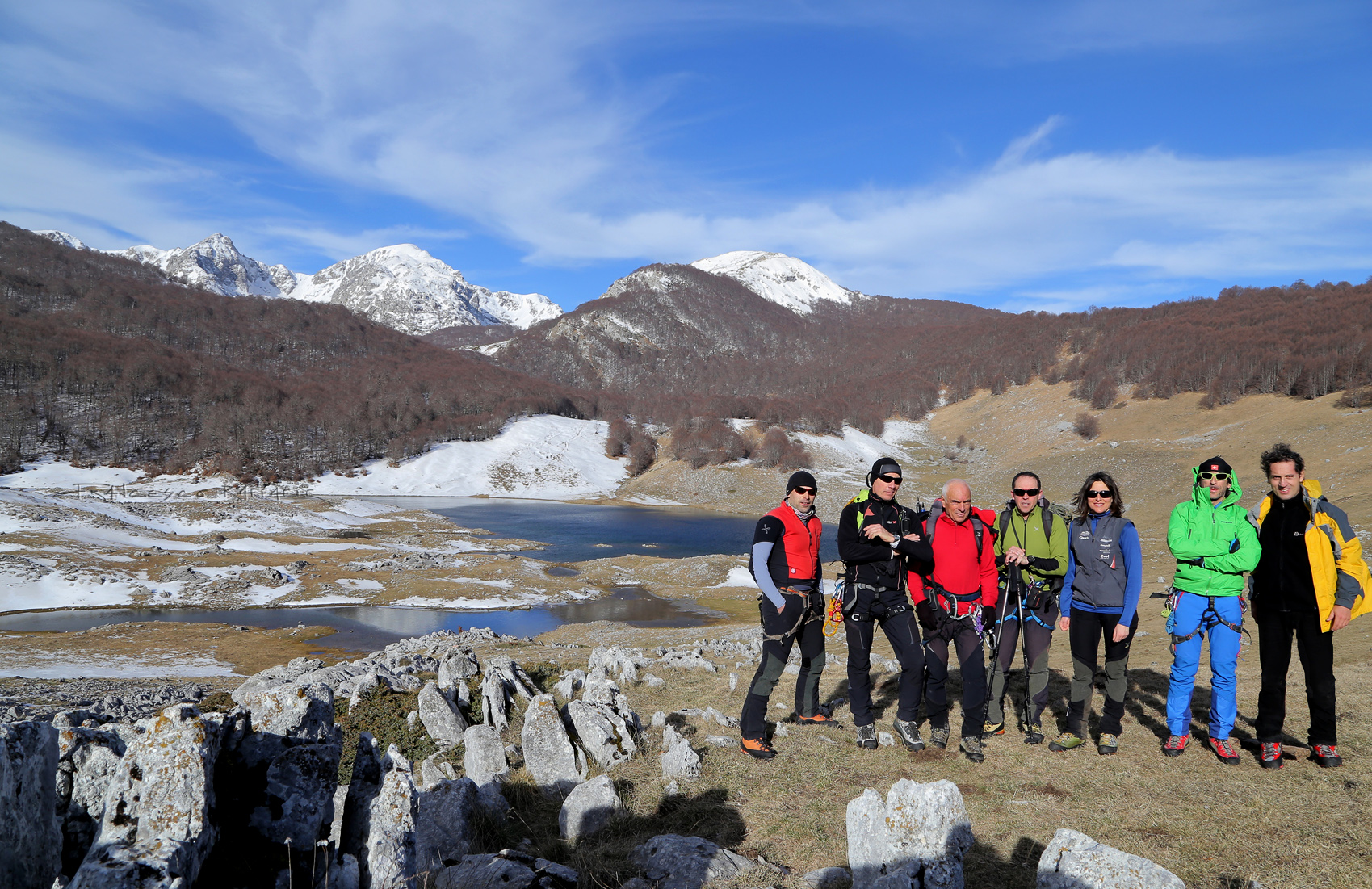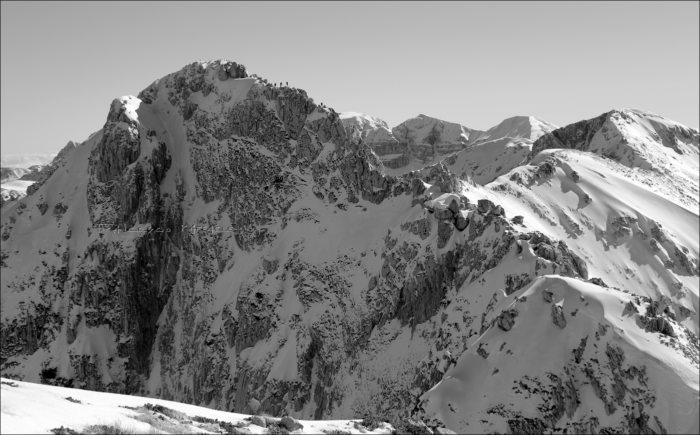 Rimango a lungo indeciso sul da farsi: riprendere la seconda piccozza e salire in cima dalla cresta (che ho già percorso in due occasioni nel 2014, a salire e a scendere, ma in altre stagioni) o fare il più largo e più facile traverso in basso? Il versante occid. ha preso sole già da un po' e la neve potrebbe cominciare a cedere. Visto che mi è già andata bene ieri sulla Meta, senza protezioni, mi metto al riparo dal vento in attesa che scendano gli altri, ma poi decido di scendere a raggiungere Daniala per salire sul Petroso: in questo modo sfrutteremo i tempi morti dell'attesa del gruppo e tralaltro, visto che la discesa degli altri 5 per la cresta N andrà comunque per le lunghe (essendo anch'essa da proteggere), penso che non è detto che avranno tempo e voglia per poi salire sul Petroso... Infatti poi ci raggiungeranno solo Massimo e Mimmo su quella che è la quarta cima della zona per quota (2249m)*, certo anche tra le più belle.