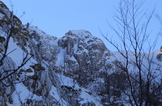 Saliti sul Petroso, scendiamo un po' per ripararci dal forte vento di NW. Dopo un po' vediamo salire Massimo e Mimmo (foto qui a sinistra), mentre gli altri 3 amici scesi dall'Innominata, si avviano già nel canale della q. 2122. Ritorniamo in cima in 4 e poi veloce discesa alla selletta e quindi giù verso la Valle Cupella e il Lago Vivo. Stavolta la discesa finale nella Valle dell'Inferno la facciamo con ancora un po' di luce. Giornata magica, ma su queste montagne abruzzesi le camminate lo sono sempre, specialmente d'inverno!