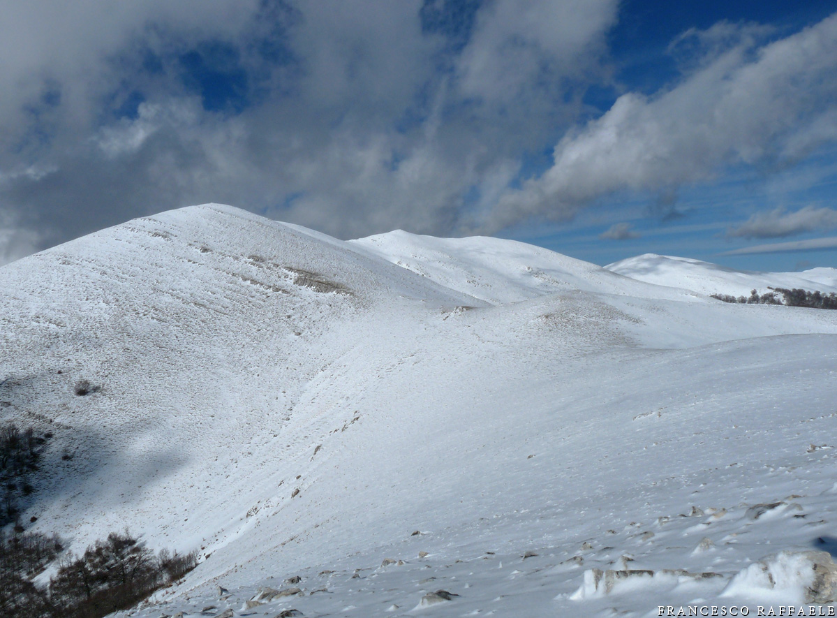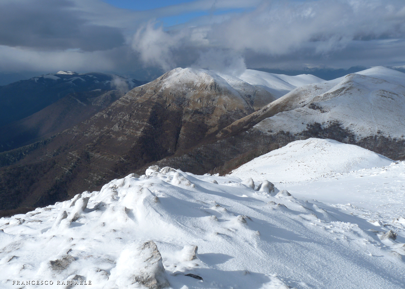 In secondo piano, al centro, il Mt. Ceraso, il boscoso valico del Balzo dei Tre Confini e lo sperone roccioso tra Valico Schiena d'Asino e Colle Valcallano (sul crinale innevato più a des. c'è il Rifugio di Iorio).