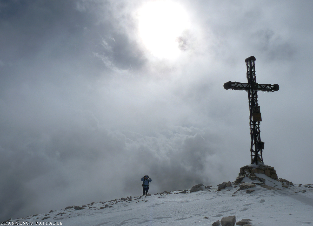 Croce di quota 1893 (anticima Sud del Cornacchia). A sinistra tra le nubi, la cima del Cornacchia