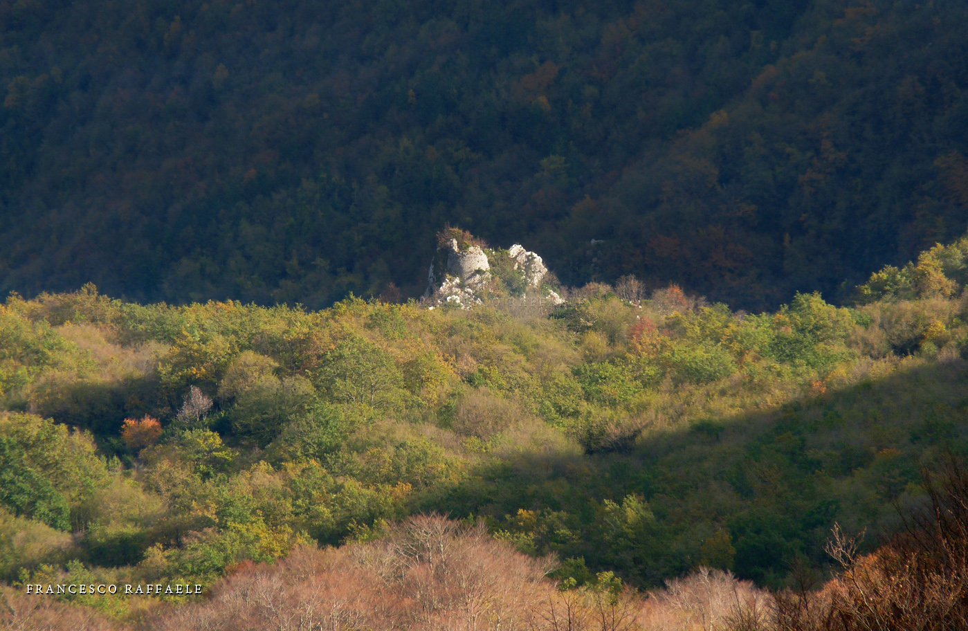Parcheggiamo sulla strada asfaltata superiore e saliamo per campagne in direzione della sterrata alta: stavolta ci teniamo più bassi quindi, invece di entrare nel Vallone di Peschiomacello presso la quota 1023 come le altre volte, seguiamo i segni rossi che passano per la Fonte Mattè, scavalchiamo il Peschiomacello (sotto gli 800m di quota) e, dopo aver lambito Colle Po e compiuto un giro a NW del Vallone, vi rientriamo a 1100-1150m circa proseguendo fino al primo anfiteatro (1650m circa) caratterizzato dal salto centrale e da una bella parete liscia a sinistra.