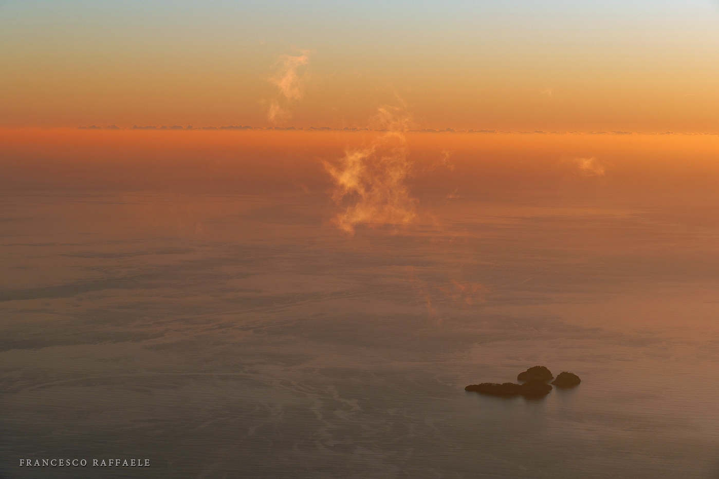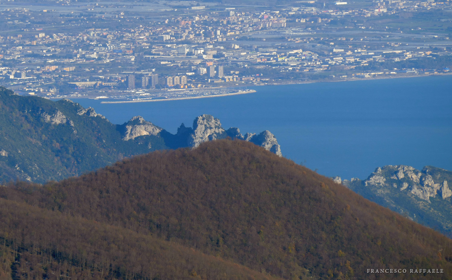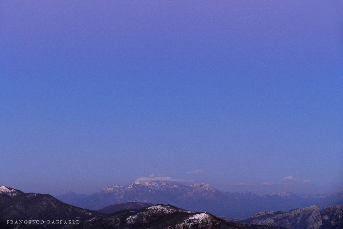 Si comincia bene: sullo sfondo si delineano i profili della Montea e Petricelle/La Caccia, del gruppo dell'Orsomarso. Sono i monti dell'entroterra di Diamante e Belvedere Marittimo, a quasi 200Km a SE in linea d'aria!