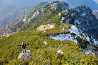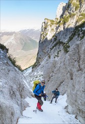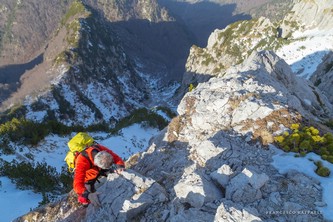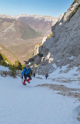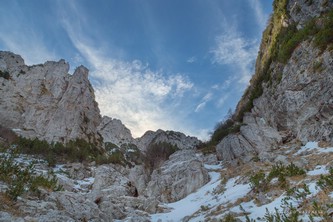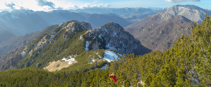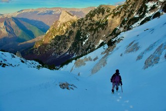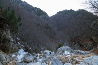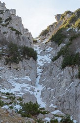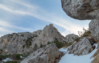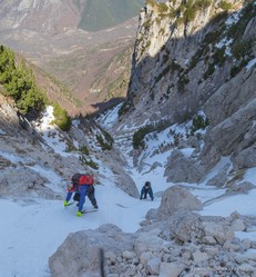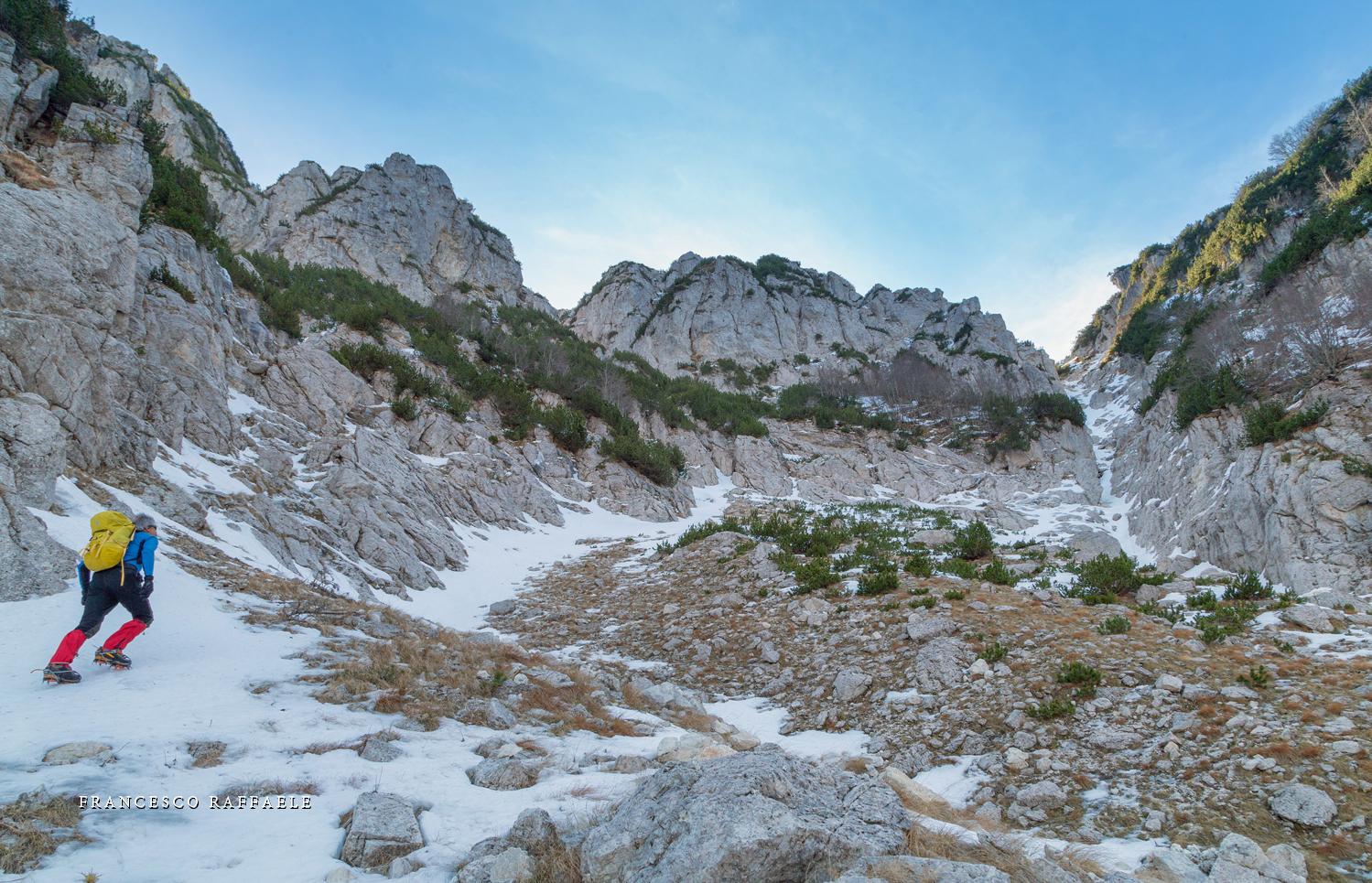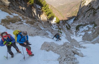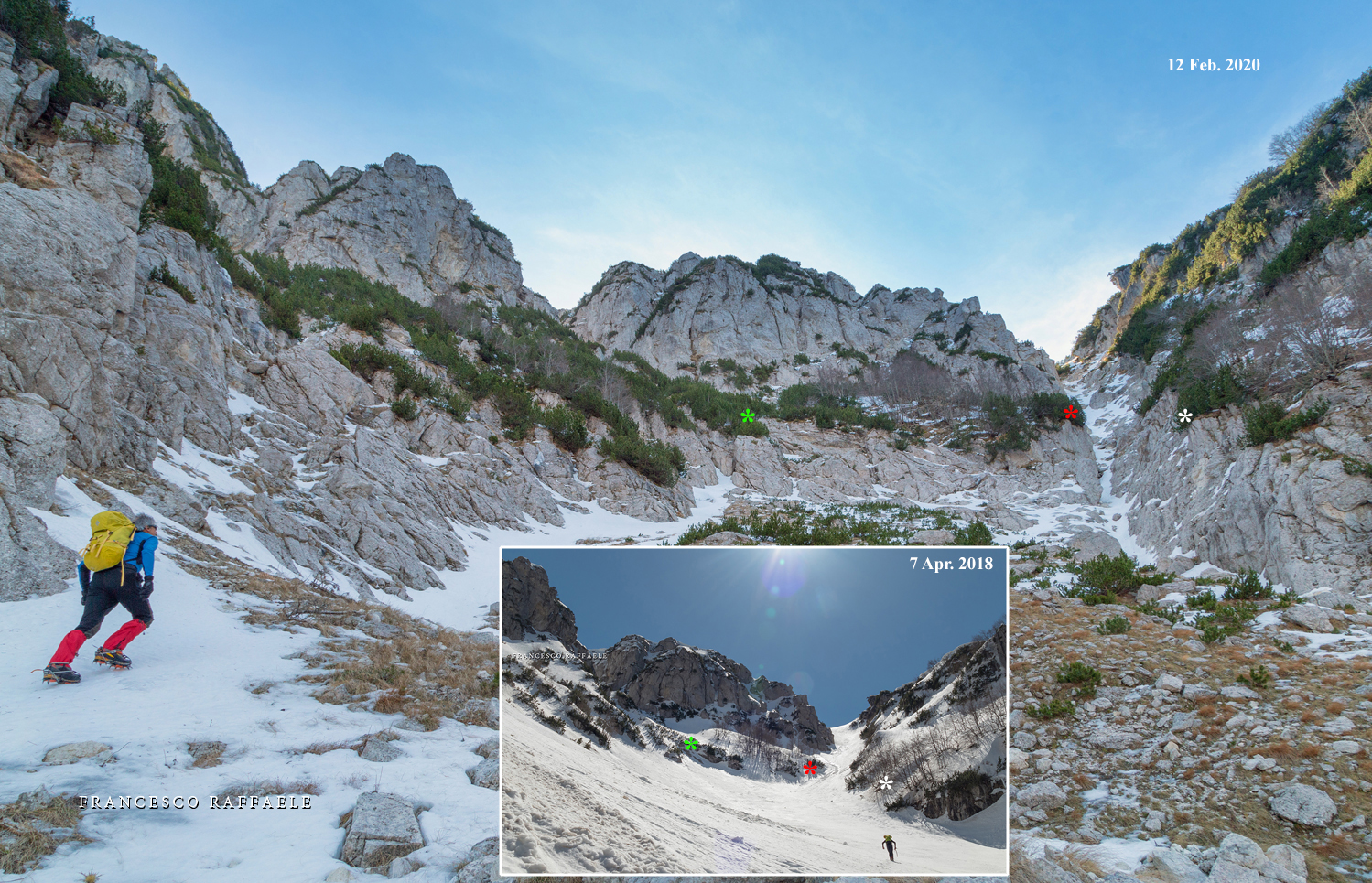 Le due vie sono brevemente descritte nelle due edizioni della GMI di Landi Vittorj (rispett. 157a e 156a nell'ediz. 1989) e sono per escursionisti esperti. Più intuitivo e meno obbligato l'accesso al "Canalino" (che conduce alla "Sella Tre Mortari"), tecnicamente facile (d'inverno F+/PD- , II), mentre la discesa nel vallone sotto al Mt. Capraro e alle pareti/canali di Passo Cavuto non richiede l'uso delle mani ma necessita di maggiore senso dell'orientamento e della conoscernza di alcuni riferimenti: è sconsigliabile farla se non si è presa confidenza con un paio di "passaggi obbligati" per rientrare al Rifugio della Liscia. Nonostante dei radi, vecchi bolli / triangoli rossi, si rischia di trovarsi tra valloni dirupati e sui relativi, alti salti. Da notare poi che in altre stagioni il buio arriva più tardi, ma la copertura arborea rende più difficile l'individuazione della via del rientro verso il Rifugio. Altra nota: la faticosa salita dalla Sella Tre Mortari sul più alto e orientale dei Tre Mortari (q. 1978), cima difesa da una breve ma molto fitta barriera di alti pini mughi. Era l'unico dei 3 (in realtà poi sono 4) su cui non ero ancora salito e ci ha portato via c. 35 min in tutto! Spossante come sempre, poi, anche il passaggio tra i mughi fino all'anticima W del Balzo della Chiesa, dopodiché i "pinastri" sono un po' più radi e ci sono dei corridoi praticati decenni fa con il seghetto dai forestali. F.R.