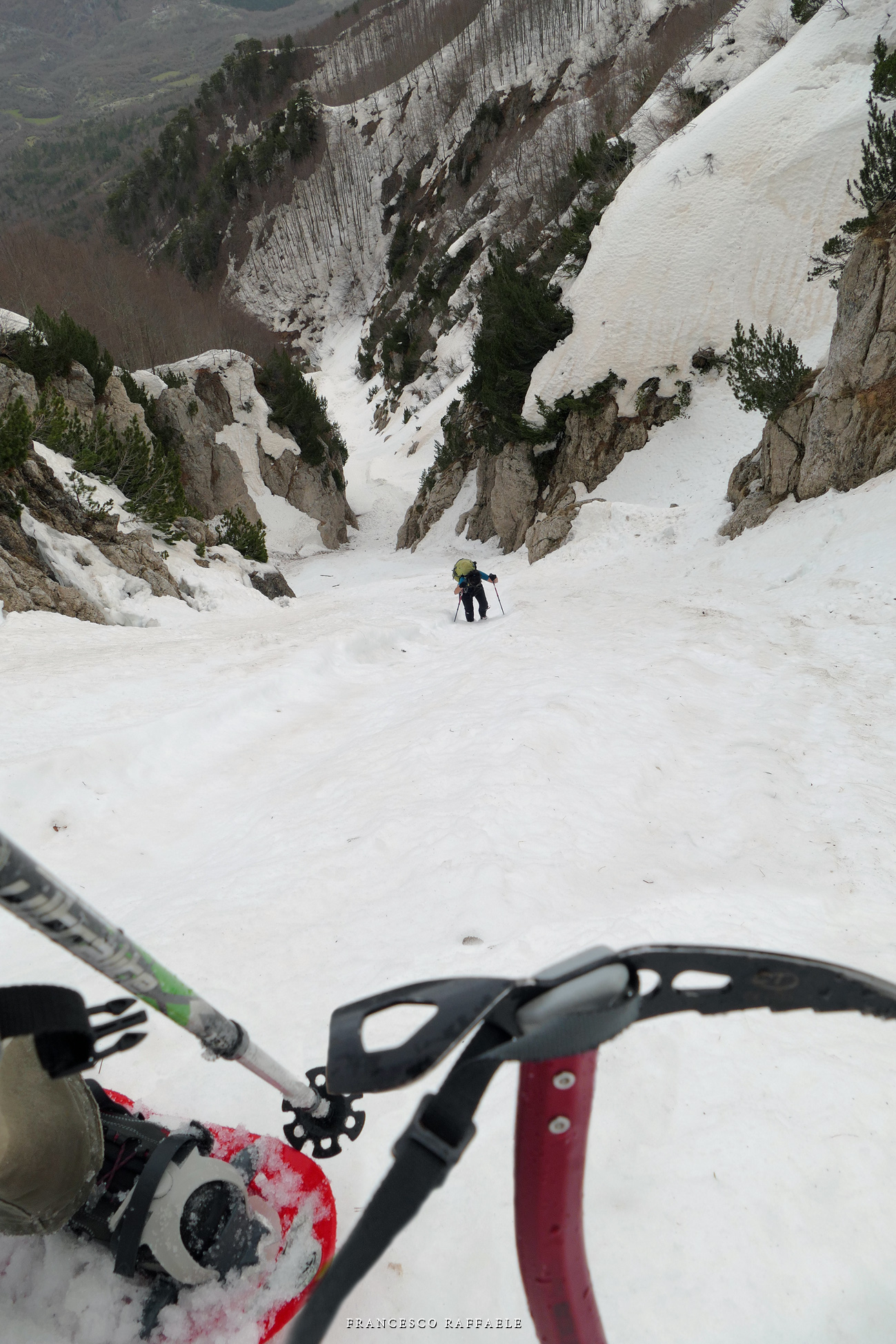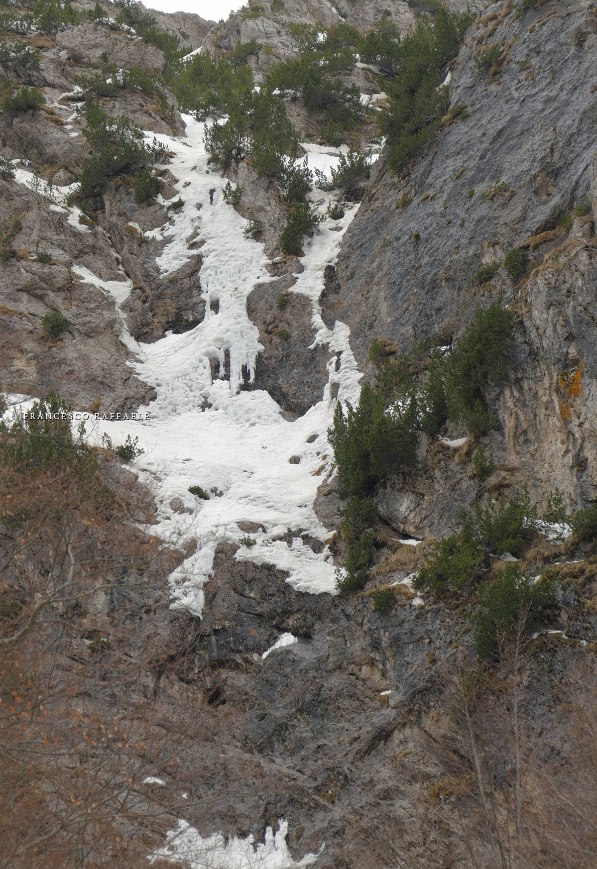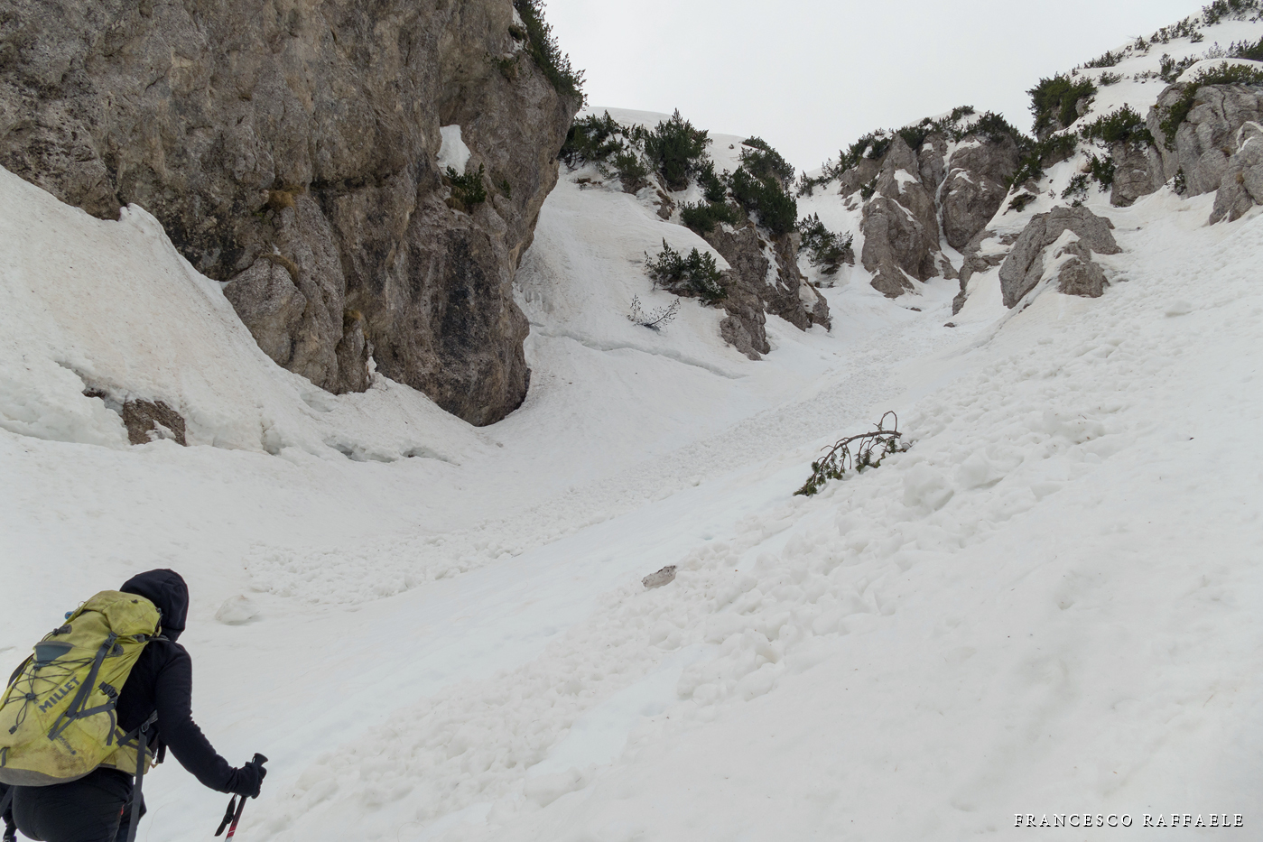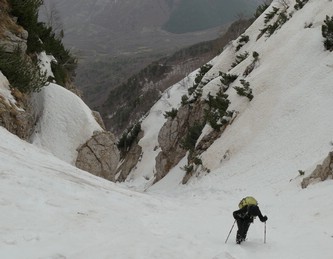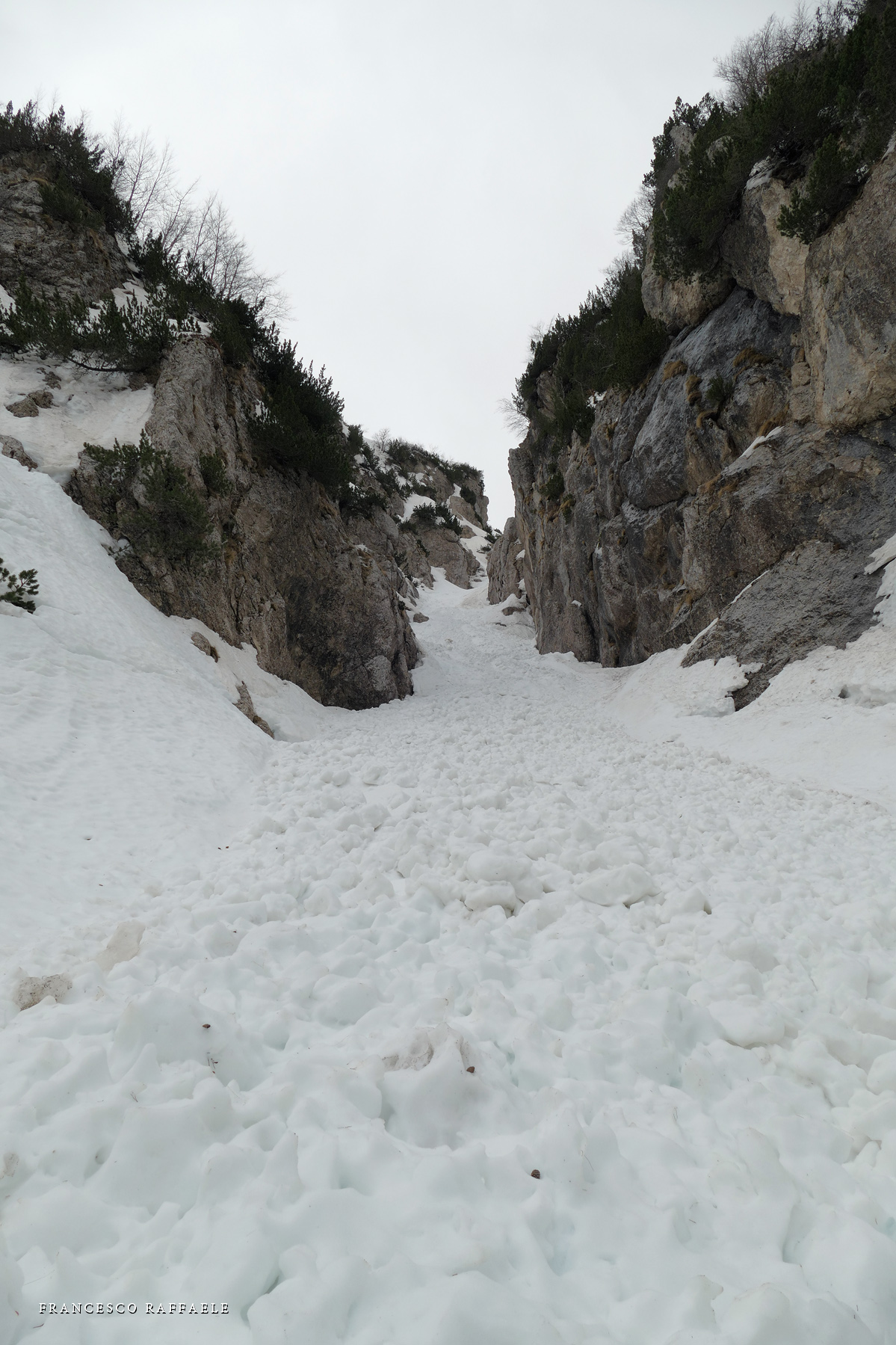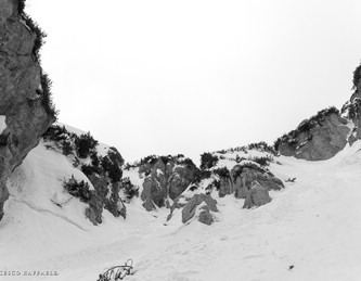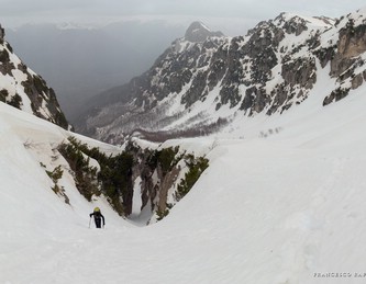 venuto da chiamarlo "La Cripta", visto che si trova proprio "sotto la Chiesa" ed è assai incassato: in questa occasione è stato possibile risalirlo facilmente (max c.45°) perché era strapieno di neve, altrimenti i salti sono più tecnici.