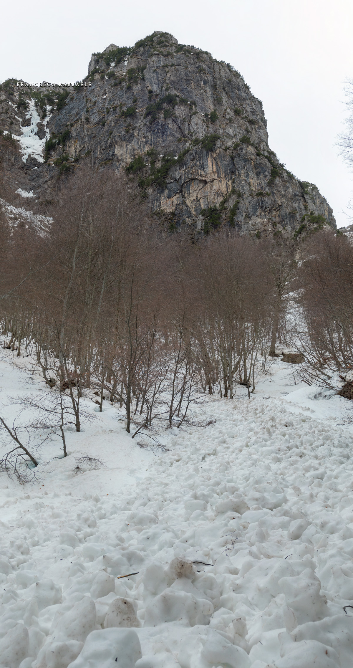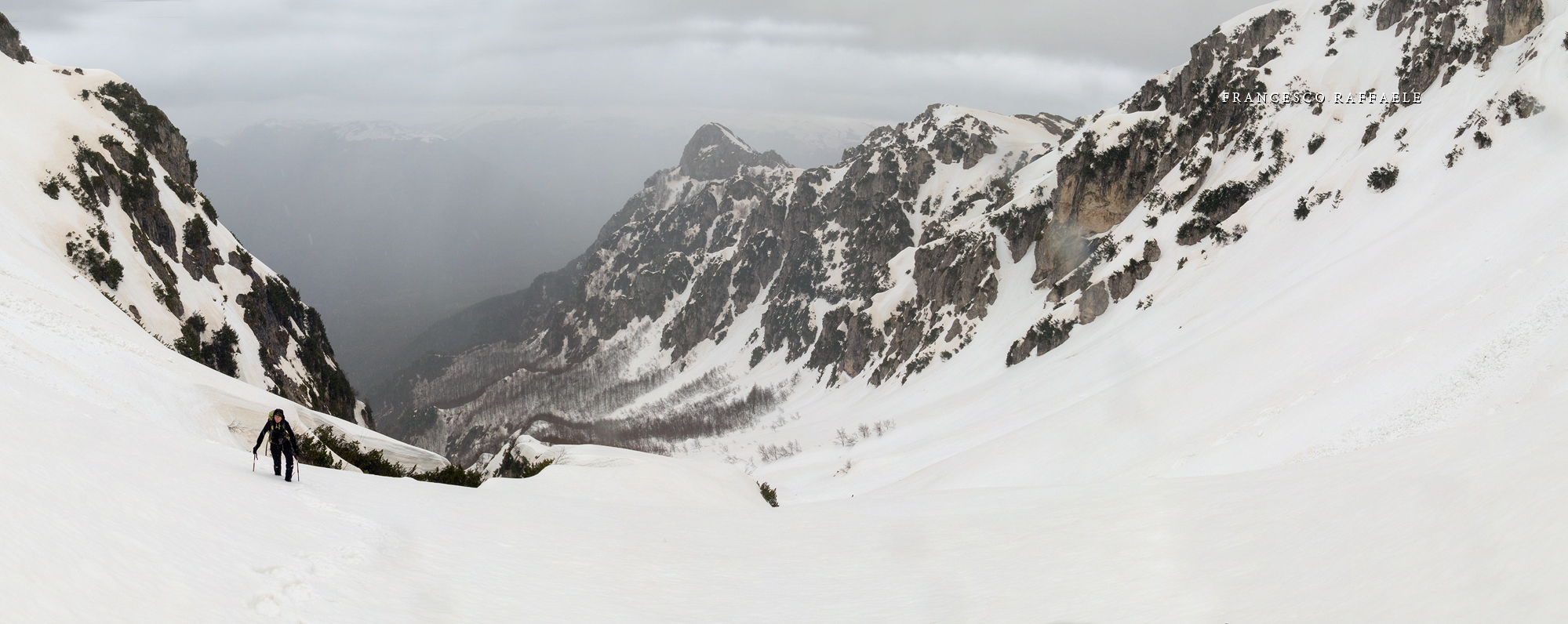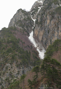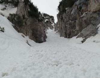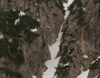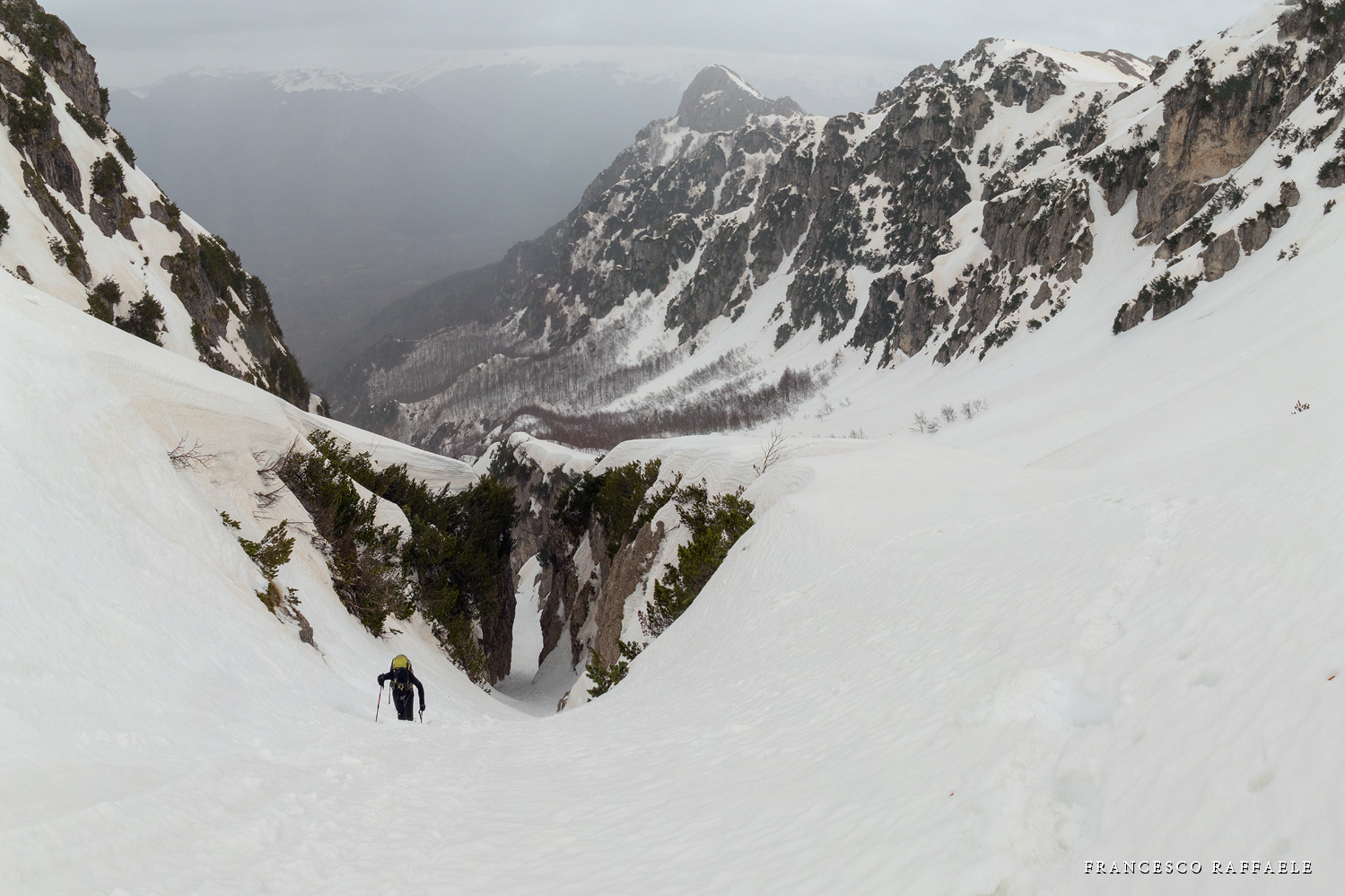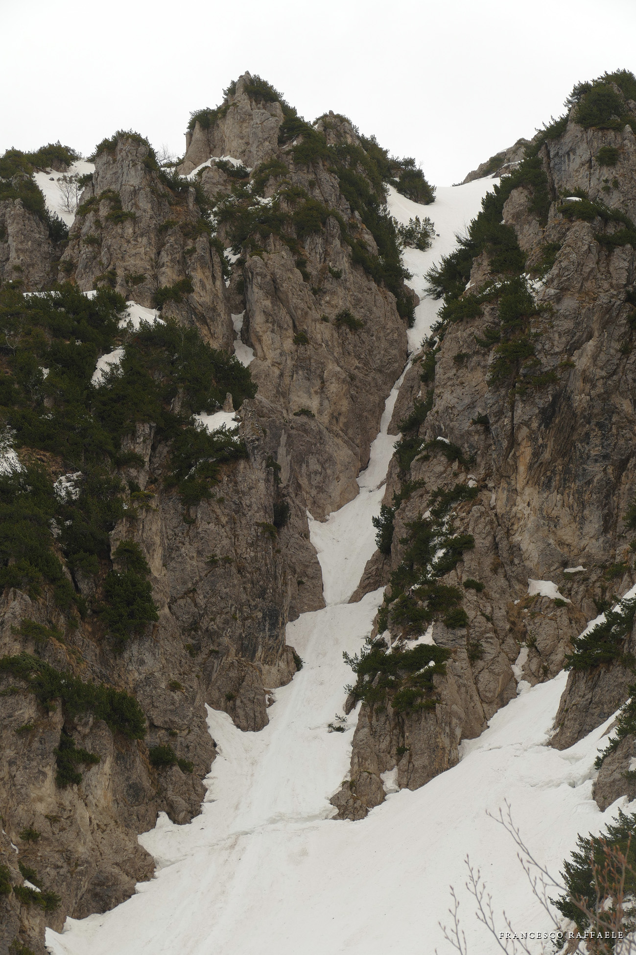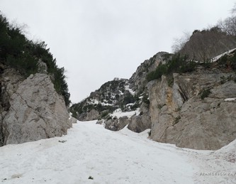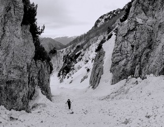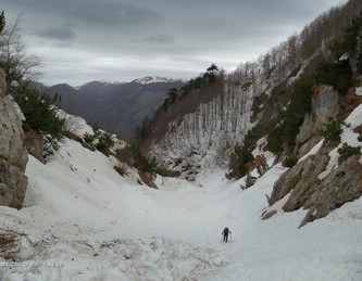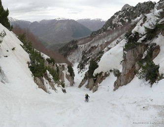 Con Francesca decido di andare a curiosare, anche perché sembra che non manchino le "vie di fuga" a sinistra (E) per uscire dal fosso ed eventualmente entrare nell'ampio "Vallone del Capraro"*. E salendo salendo percorriamo tutto il tetro canalone sotto le pareti E del Balzo della Chiesa (lo si potrebbe perciò chiamare "Canalone della Cripta", se non ha già altro nome) fino alla strettoia finale che sbuca (a c. 1930m) nella parte alta del "Vallone del Capraro", poco al di sotto della Forcella di Monte Capraro (q. 1993m). In queste condizioni d'innevamento il Canale è facile (F, max 45°) e con la neve primaverile non abbiamo neanche messo i ramponi (io l'ho percorso interamente con piccozza e ciaspole, ciaspole che ho tenuto per tutto l'intero percorso a monte del Rifugio Belvedere della Liscia).