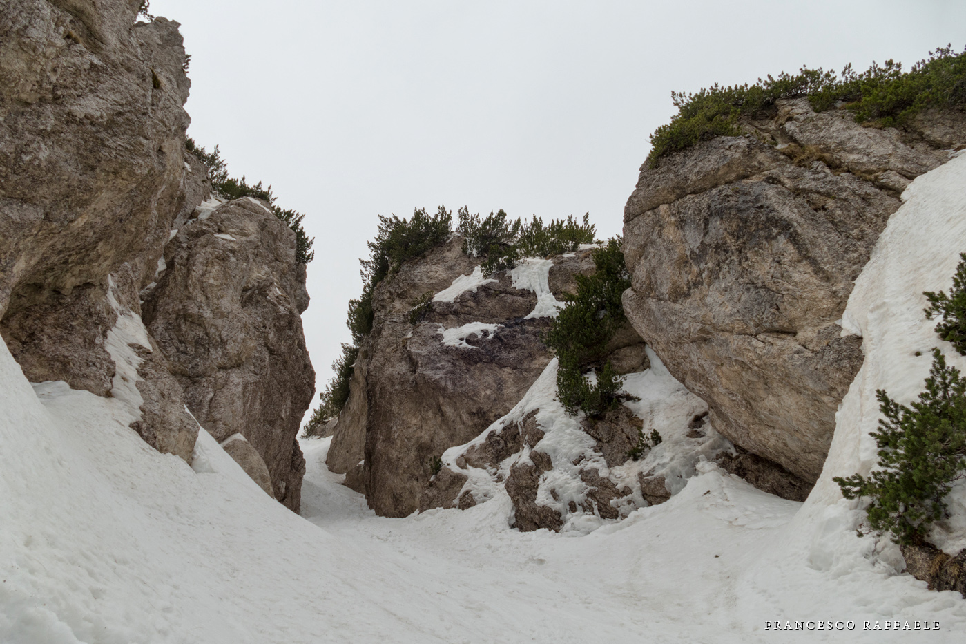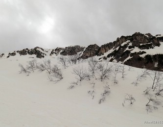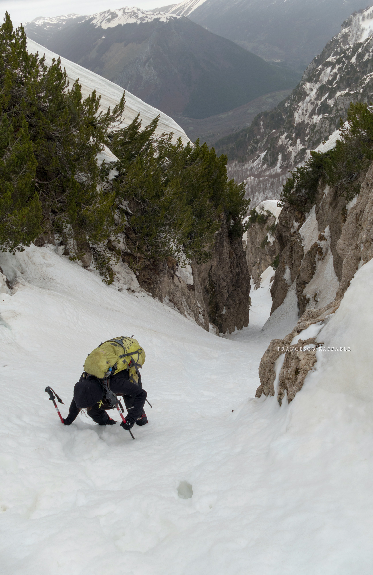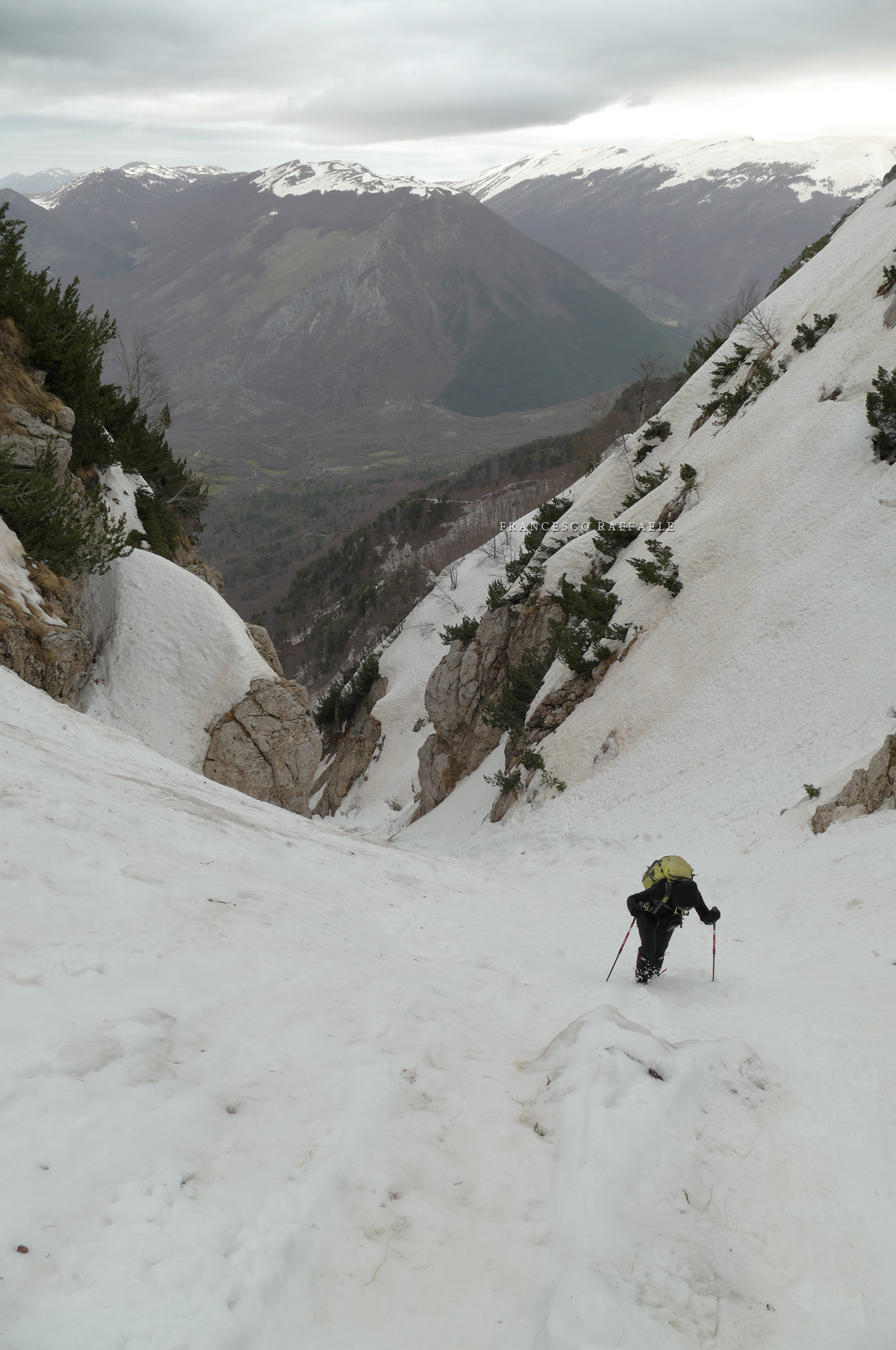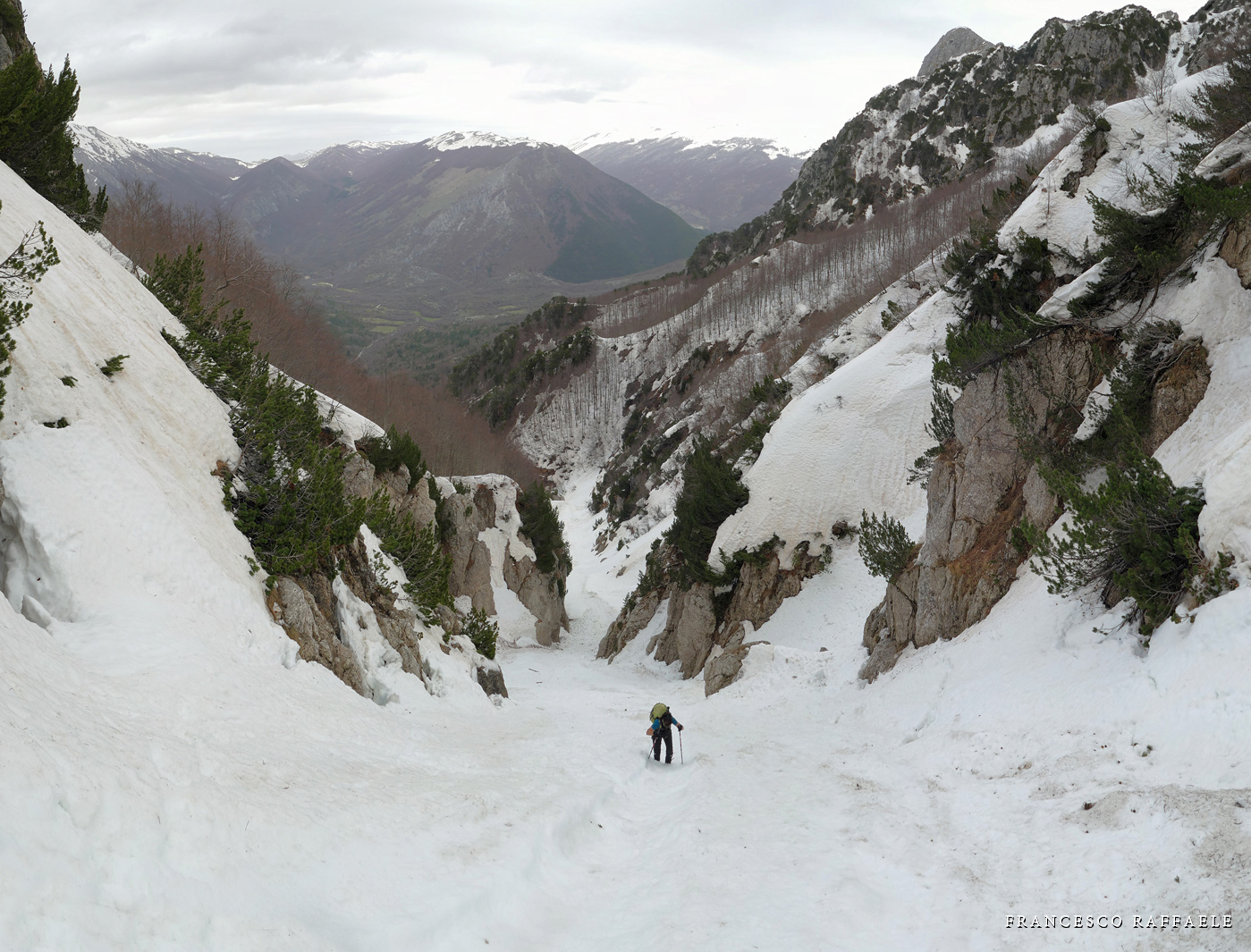 Con Francesca decido di andare a curiosare, anche perché sembra che non manchino le "vie di fuga" a sinistra (E) per uscire dal fosso ed eventualmente entrare nell'ampio "Vallone del Capraro"*. E salendo salendo percorriamo tutto il tetro canalone sotto le pareti E del Balzo della Chiesa (lo si potrebbe perciò chiamare "Canalone della Cripta", se non ha già altro nome) fino alla strettoia finale che sbuca (a c. 1930m) nella parte alta del "Vallone del Capraro", poco al di sotto della Forcella di Monte Capraro (q. 1993m). In queste condizioni d'innevamento il Canale è facile (F, max 45°) e con la neve primaverile non abbiamo neanche messo i ramponi (io l'ho percorso interamente con piccozza e ciaspole, ciaspole che ho tenuto per tutto l'intero percorso a monte del Rifugio Belvedere della Liscia).