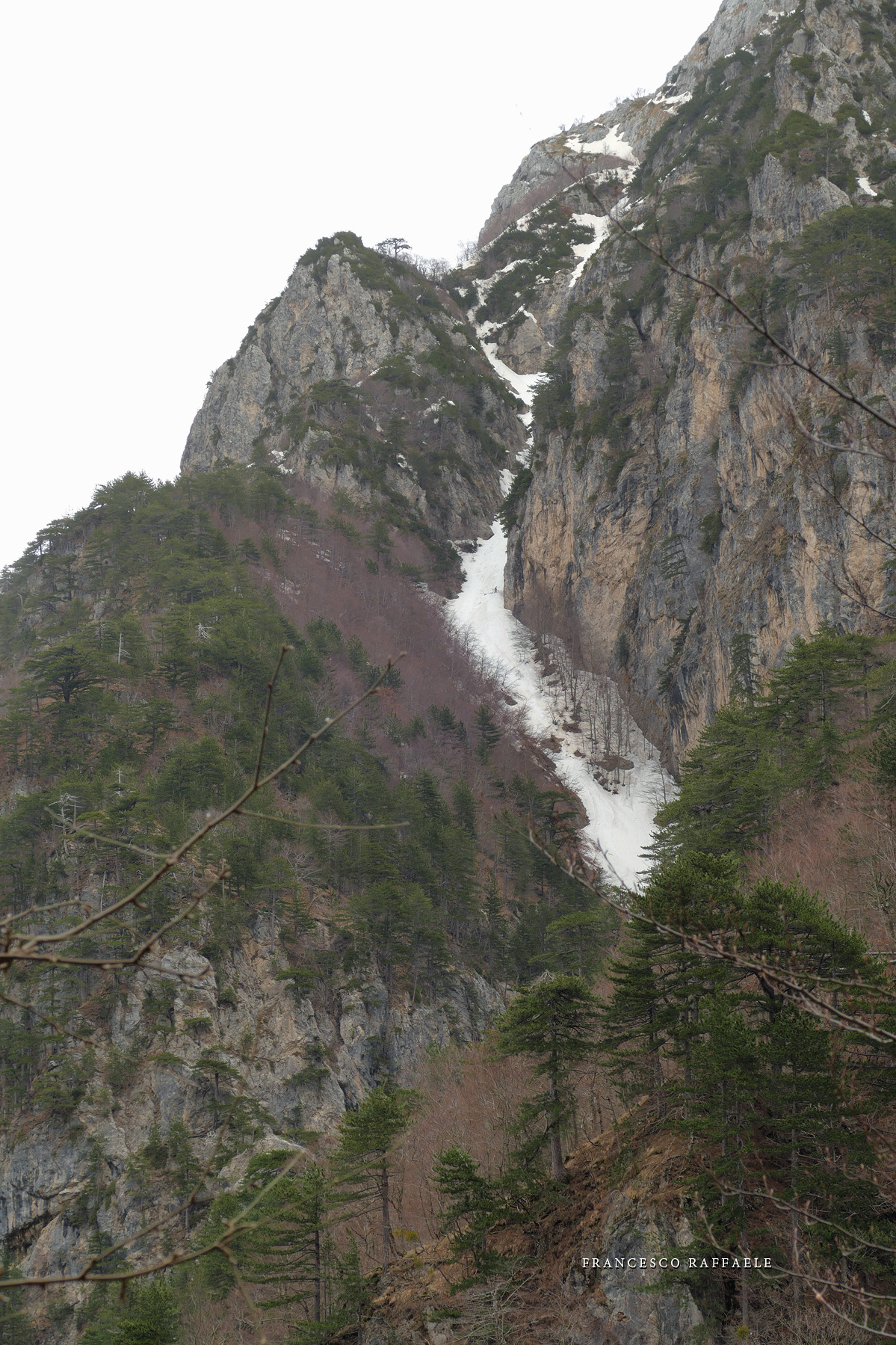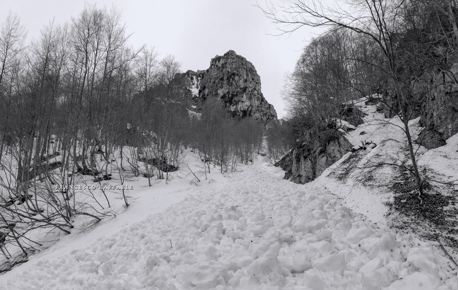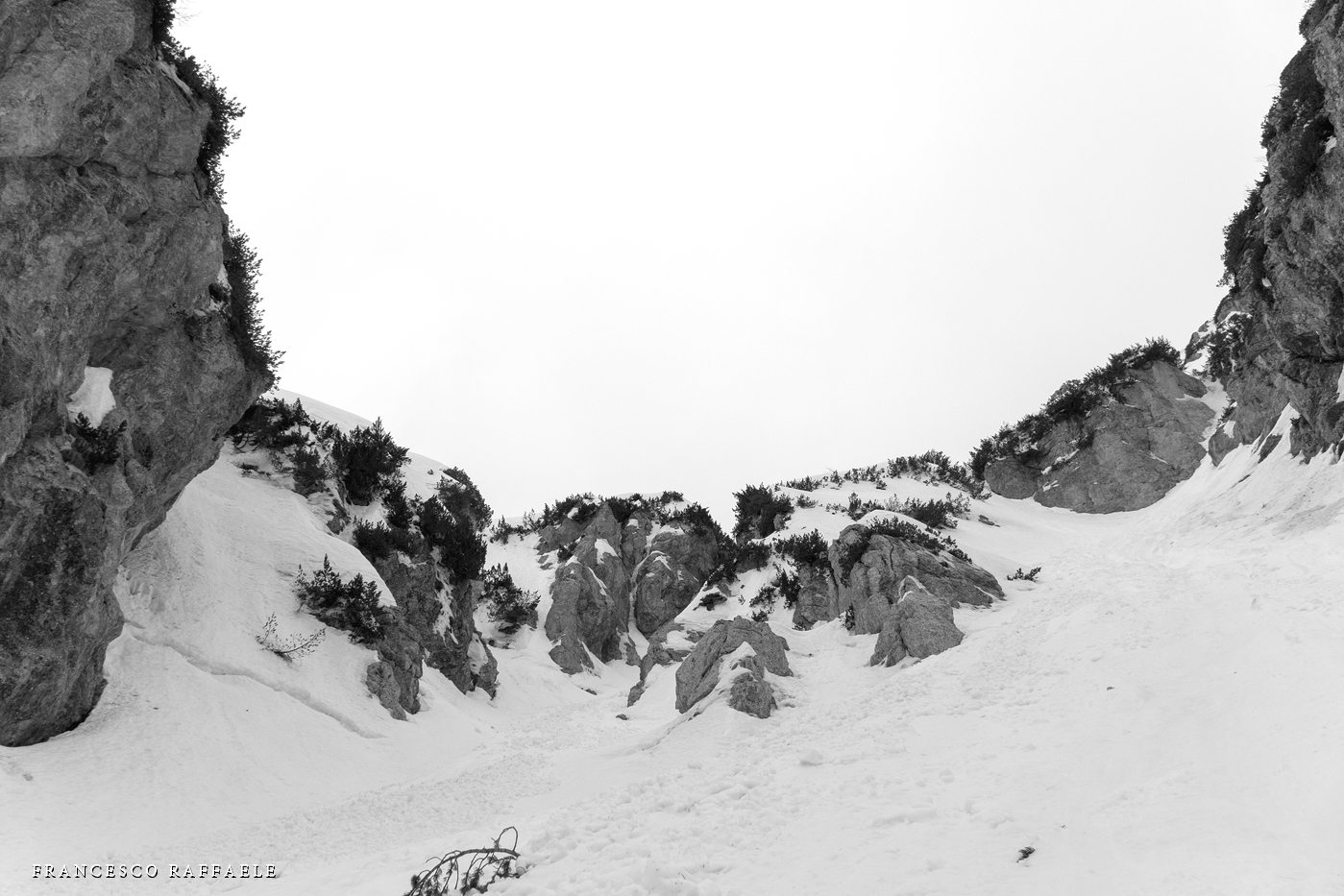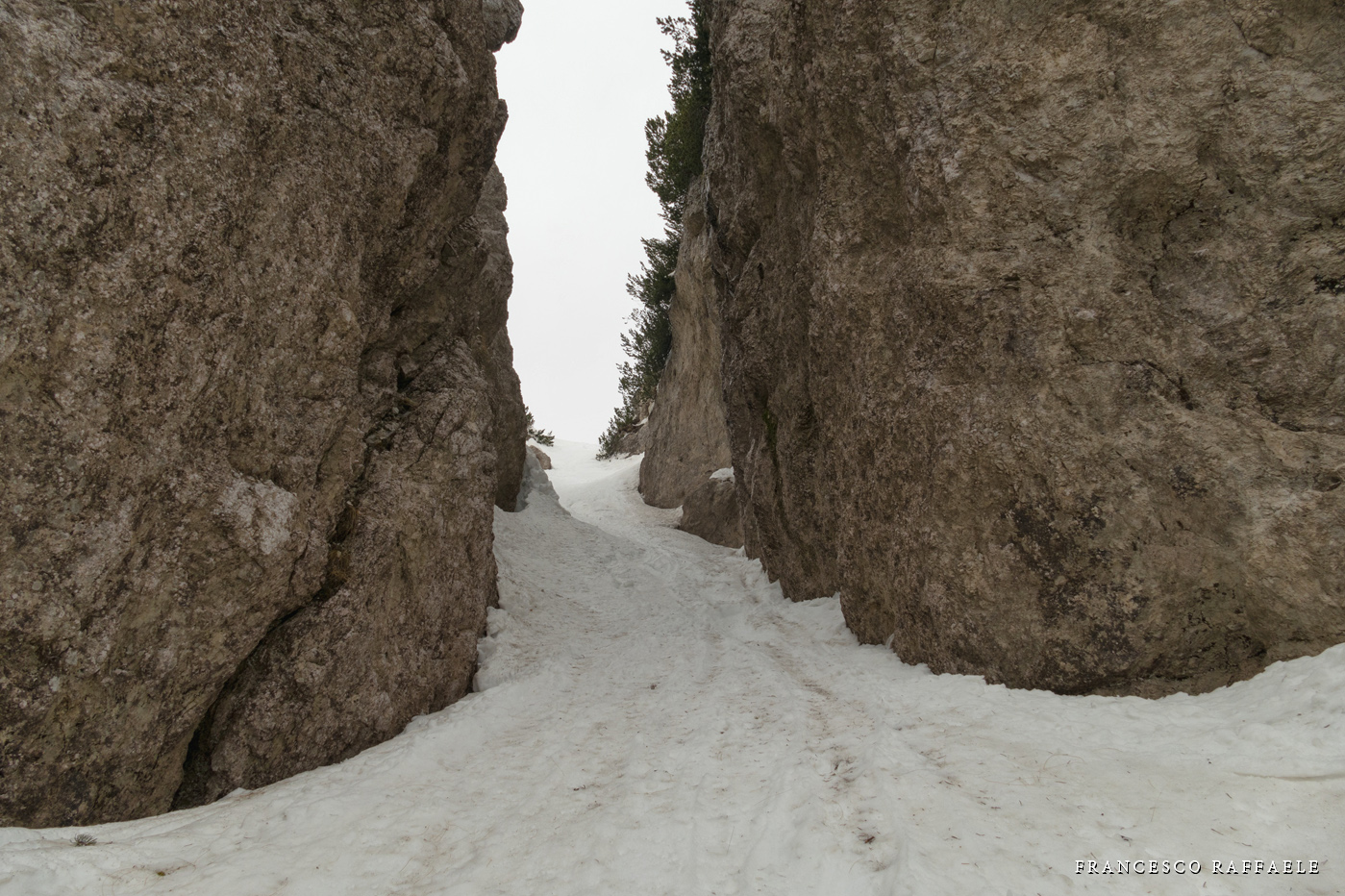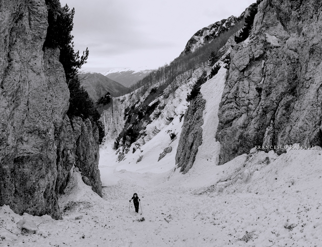 Con Francesca decido di andare a curiosare, anche perché sembra che non manchino le "vie di fuga" a sinistra (E) per uscire dal fosso ed eventualmente entrare nell'ampio "Vallone del Capraro"*. E salendo salendo percorriamo tutto il tetro canalone sotto le pareti E del Balzo della Chiesa (lo si potrebbe perciò chiamare "Canalone della Cripta", se non ha già altro nome) fino alla strettoia finale che sbuca (a c. 1930m) nella parte alta del "Vallone del Capraro", poco al di sotto della Forcella di Monte Capraro (q. 1993m). In queste condizioni d'innevamento il Canale è facile (F, max 45°) e con la neve primaverile non abbiamo neanche messo i ramponi (io l'ho percorso interamente con piccozza e ciaspole, ciaspole che ho tenuto per tutto l'intero percorso a monte del Rifugio Belvedere della Liscia).