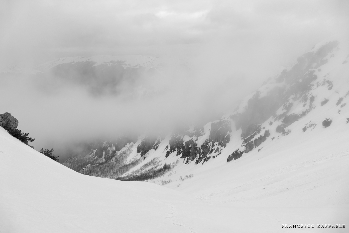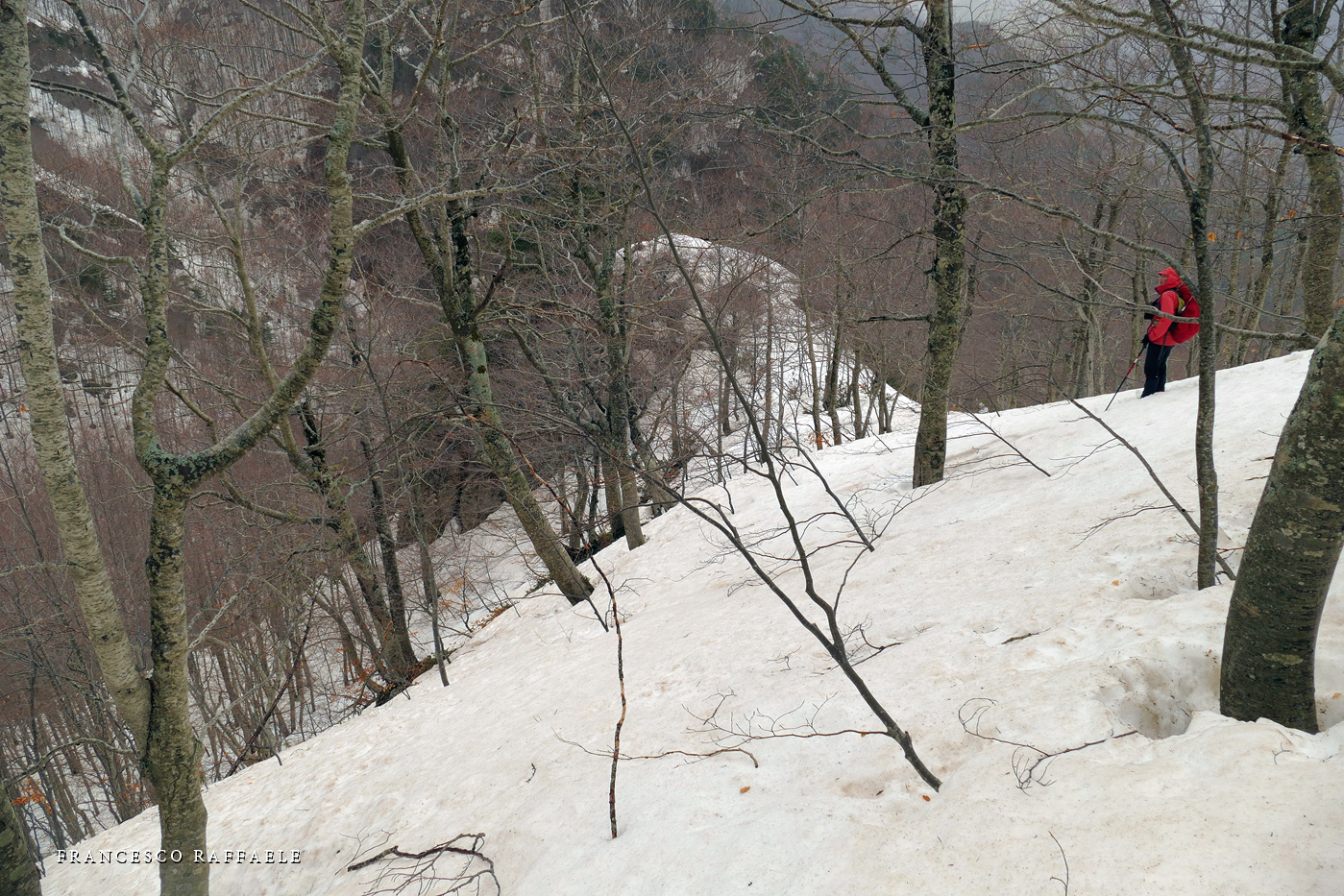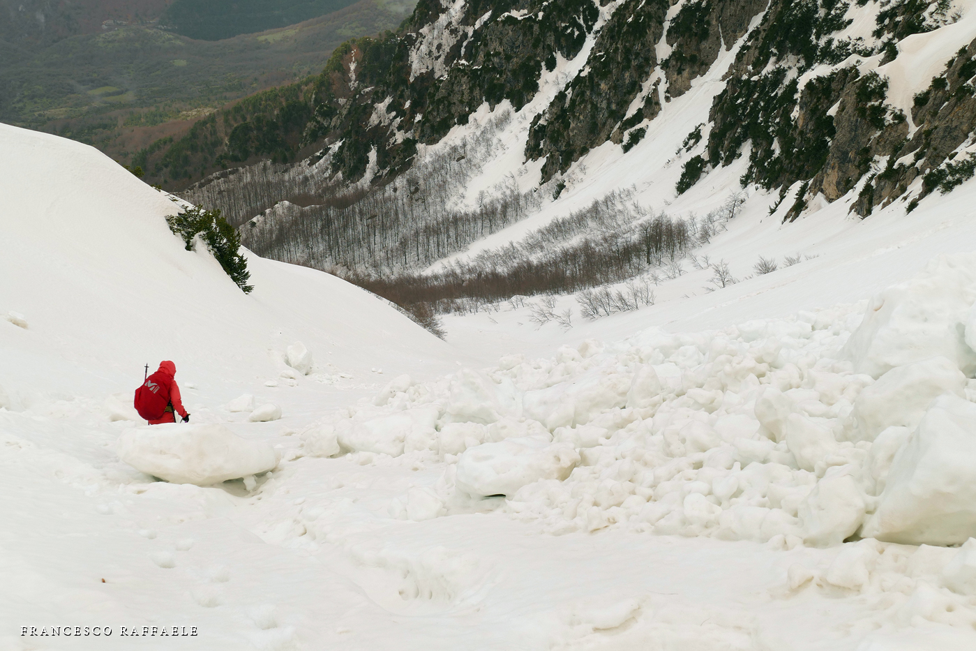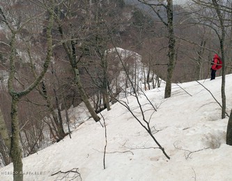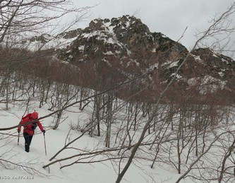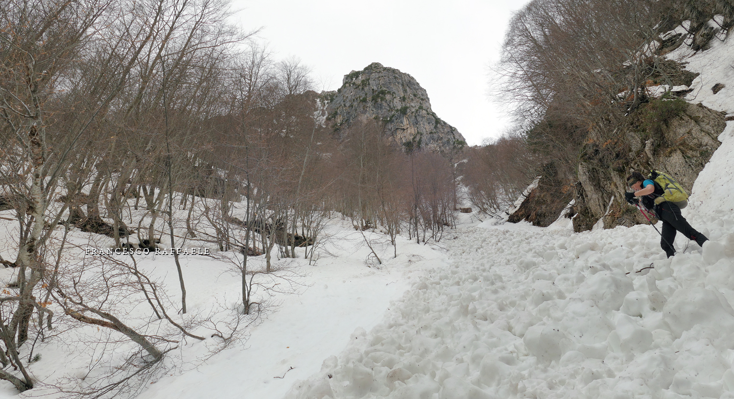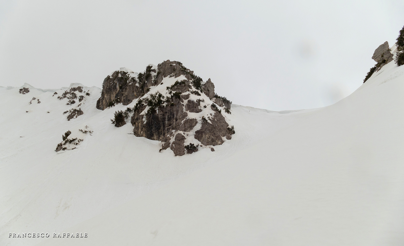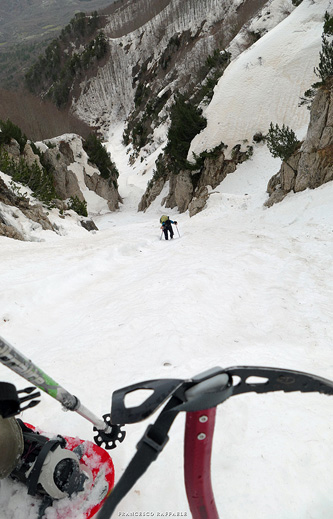 Ma una volta sotto le pendici NNE del Balzo della Chiesa, il Canale/Fosso - assai incassato e con salti rocciosi non facili (inf. pers. R. Di Cosmo)- è troppo invitante, perché colmo di neve svalangata che sembra coprire i salti.