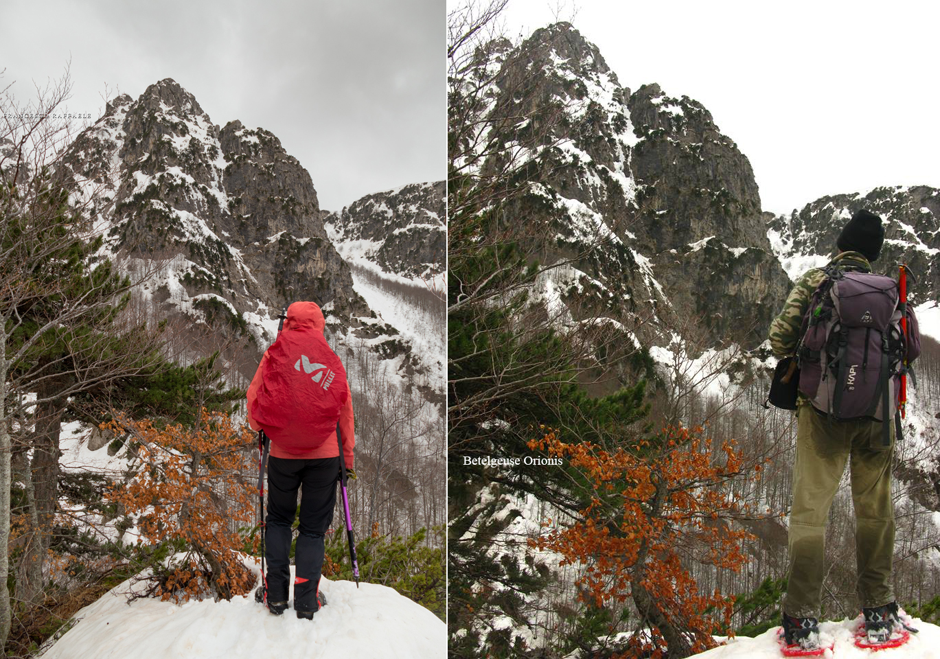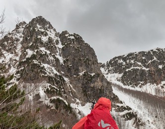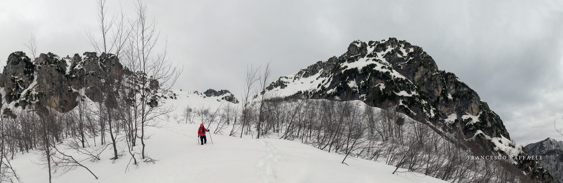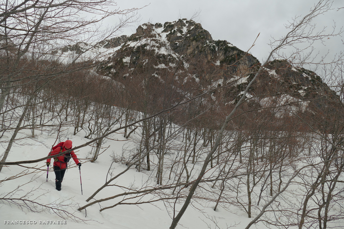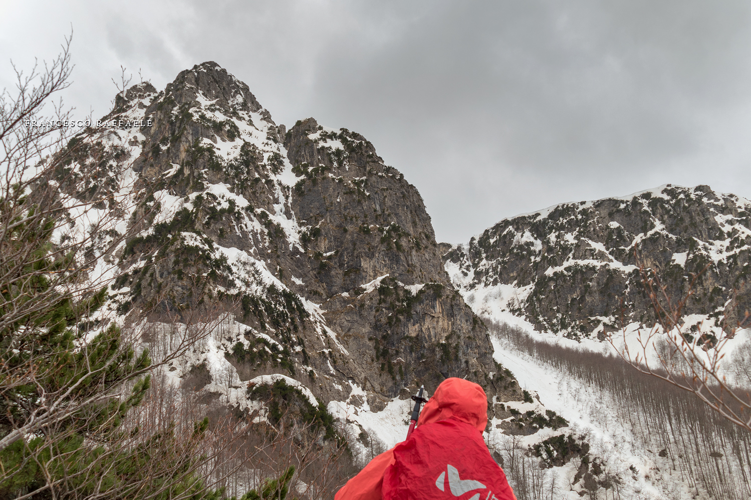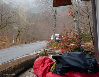 All'uscita dal canalone comincia a piovere. Poco più sopra, alla Forcella di Mt. Capraro, arrivano da Sud forti folate di scirocco, che qui è freddo.