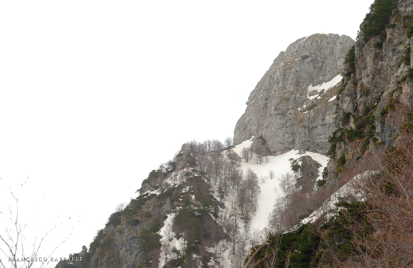 "Vallone del Capraro" e Balzo della Chiesa. A sin., da sotto lo spigolo NE e poi sotto le pareti E del Balzo della Chiesa, si sviluppa il Canalone risalito (se ne intravede un tratto): non so se abbia un nome alpinistico, ma mi è