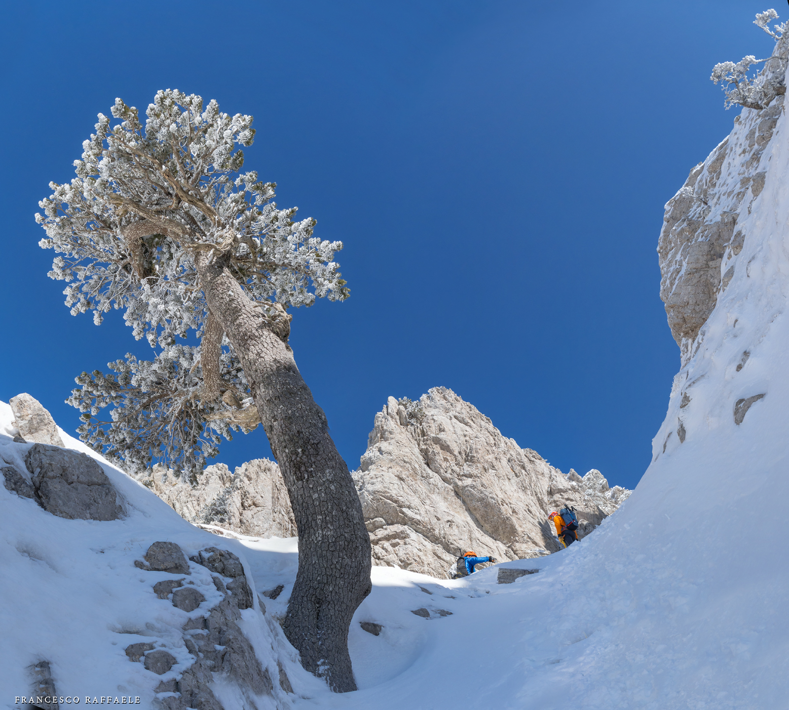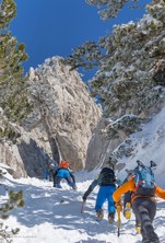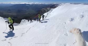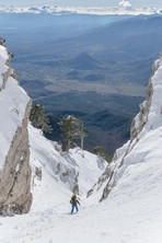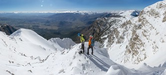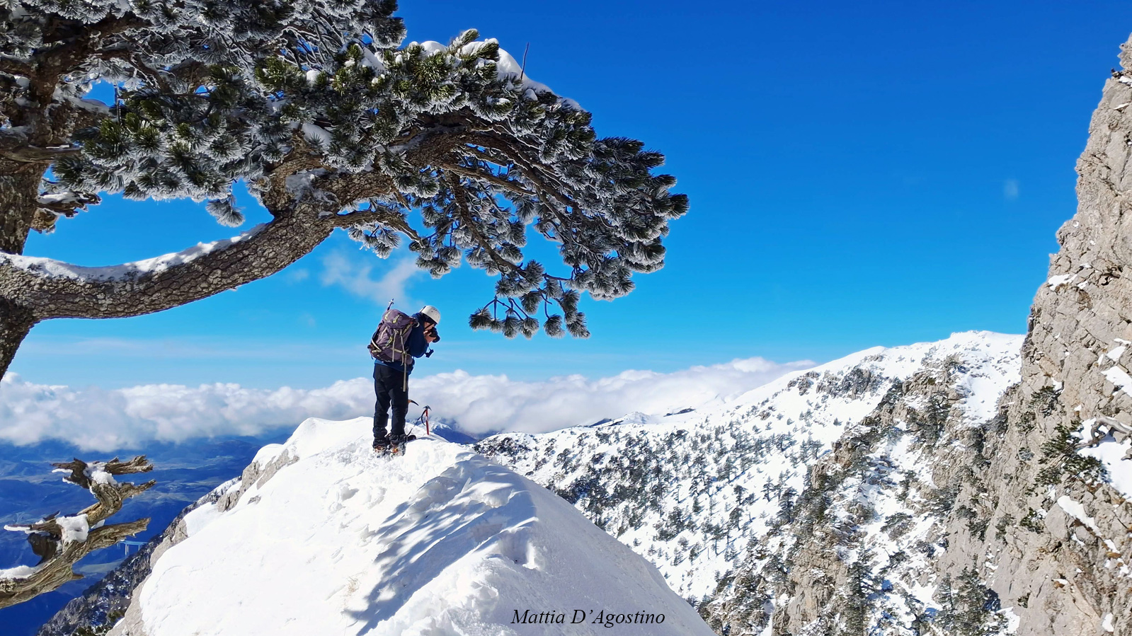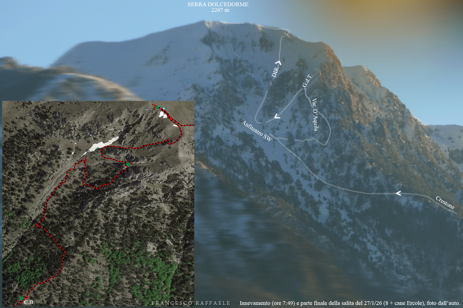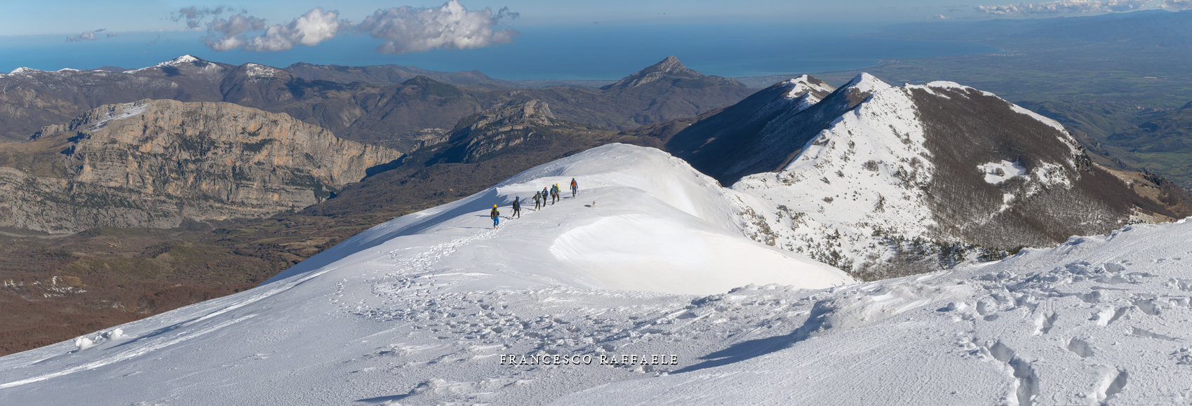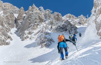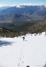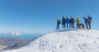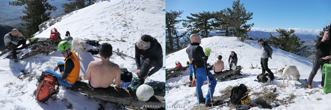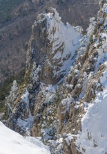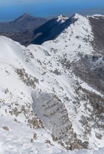 Si sale per la via canonica ma, una volta nella maestosità dell'Anfiteatro SW, da dietro scatta il cambio di programma e si traversa in lieve discesa a S per andare a intercettare la Variante D'Aquila, facile canalino che sbuca da S a metà (o a 1/3) della Direttissima inferiore/di destra o Gola del Turbine. Qui sento Andrea gridare che il pur forte Ercole ha dei problemi sul ghiaccio ripido... alla fine però si svalica e quasi tutti scendiamo nella strettoia della GdT (Ercole invece la risale, per poi riacchiapparci su in cima) e doppiato lo spigolone-prua (q. 2000 m ca) che divide le due direttissime, andiamo a risalire quella classica a sin/N (l'intento era fare una delle varianti più ripide e dirette, ma hanno preso sole e la neve è più molle). In cima non si sta male, anche perché il vento è poco, ben lontano da quello dell'ultimo giro (23/11/2025). Mezz'oretta di sosta panini sotto la cima e si riparte con il mar Ionio e il Sellaro di fronte. Prima dell'ultima anticima E ci caliamo nella Via Luzzo, scorciatoia facile (con questa neve!) e gradita variante rispetto al giro più largo per il Vallone Faggio Grosso. C'è poco da aggiungere se non che: «Entrare qui dentro è sempre un grande privilegio» (M. Ippolito, riferito al canalone della Direttissima), discorso che si può estendere all'intera "gita" da sud al Dolcedorme. E forse il problema di questi tempi moderni è proprio che tecnologie, strade e altre agevolazioni fanno perdere ai più la sensazione e la consapevolezza che giungere sulle montagne equivale sbirciare un po' nelle anticamere dell'Eden o tra le porte del Paradiso, restando avvolti nella bellezza senza tempo che polverizza l'oscena realtà odierna! [13 Km / +1690 m disliv. / 8h 25'] F.R. |