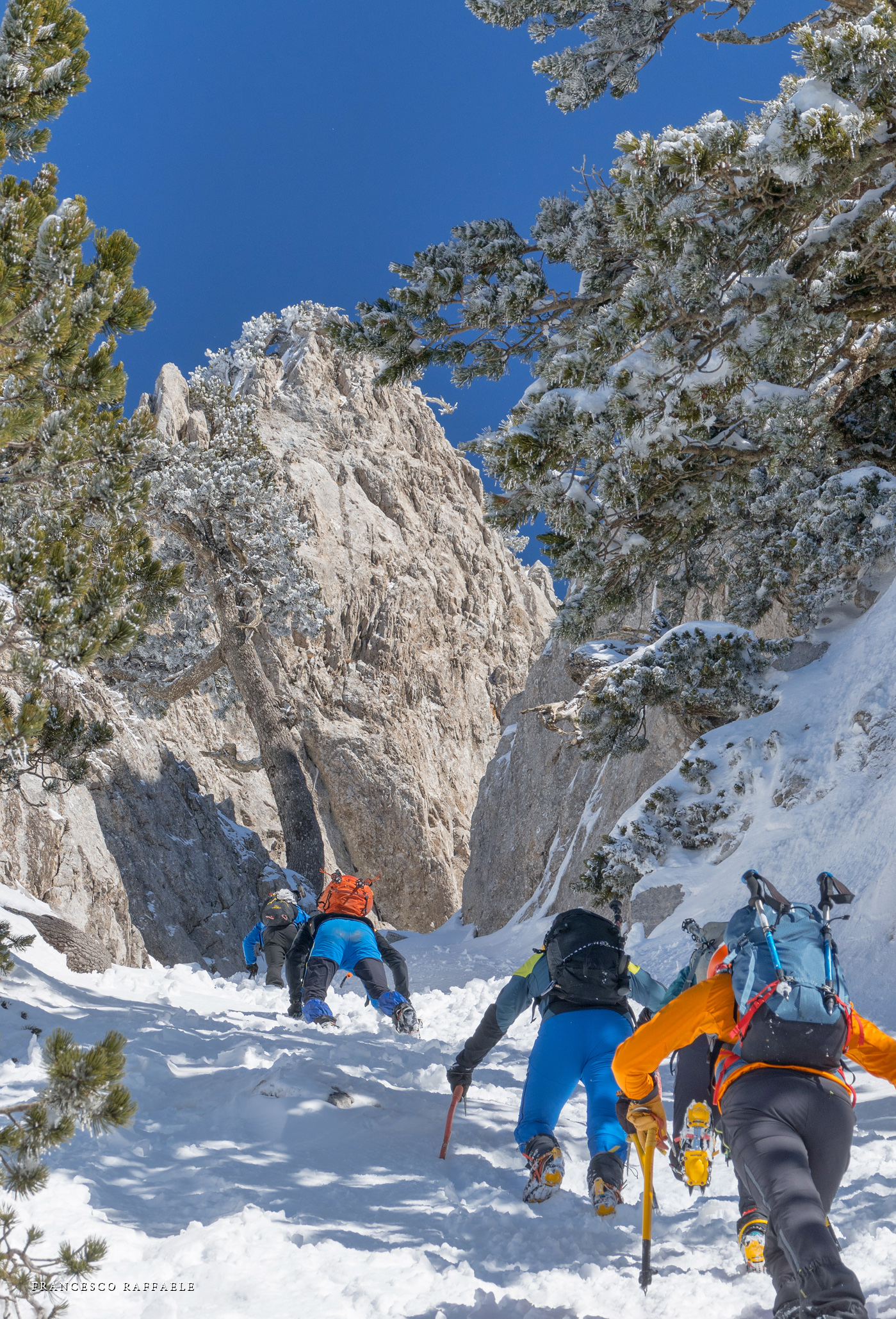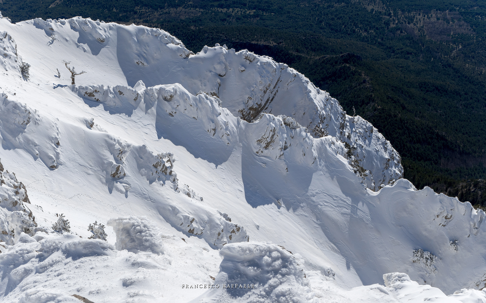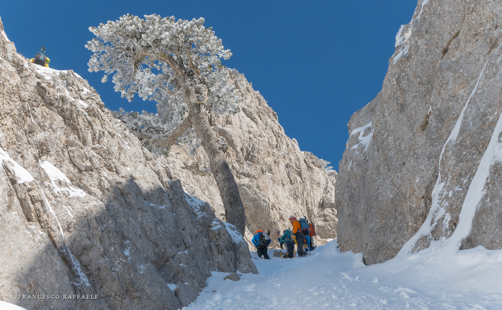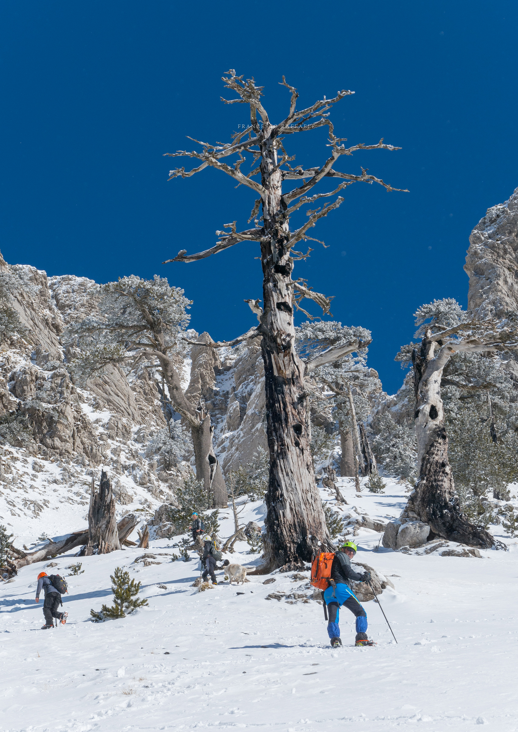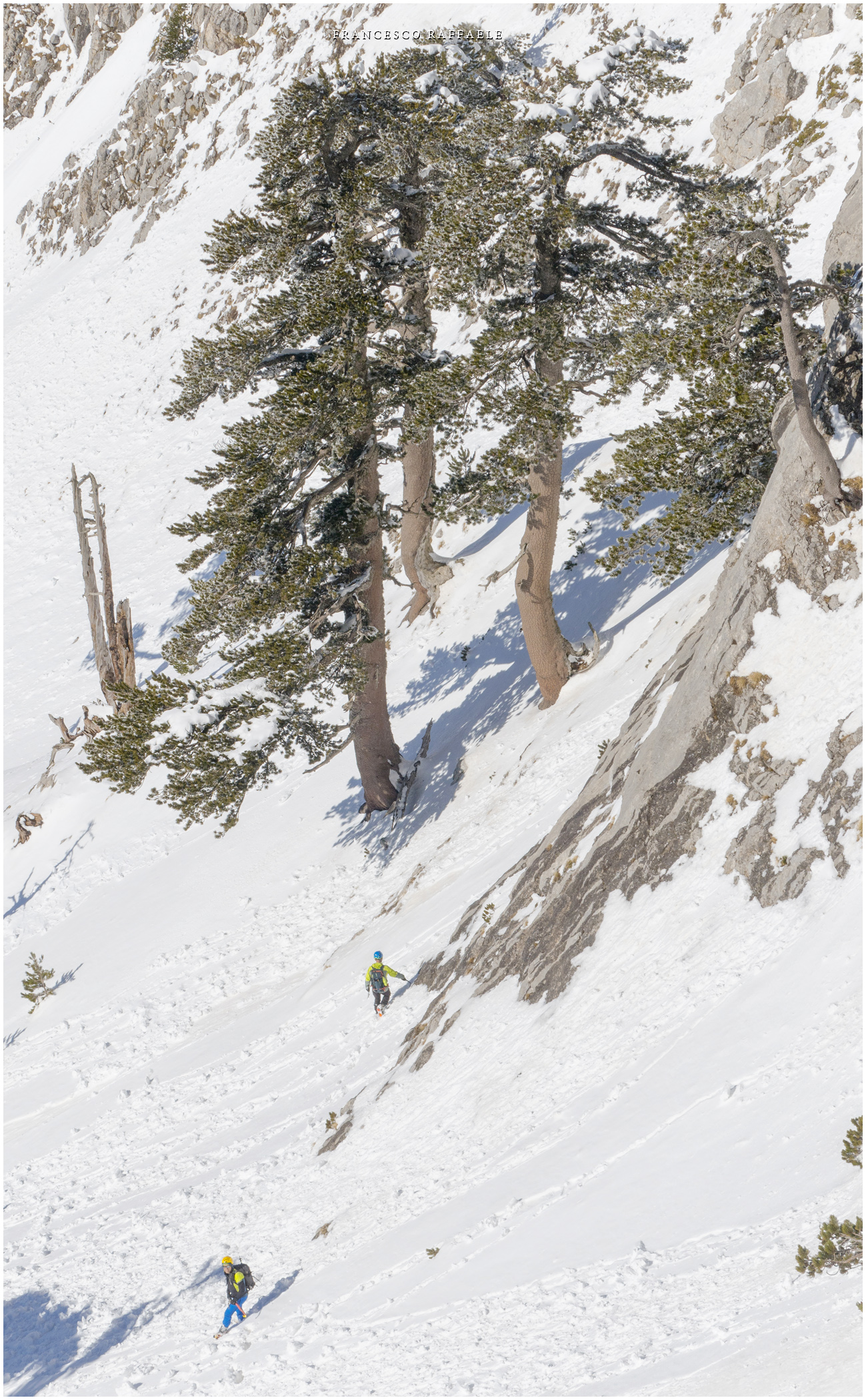 Si sale per la via canonica ma, una volta nella maestosità dell'Anfiteatro SW, da dietro scatta il cambio di programma e si traversa in lieve discesa a S per andare a intercettare la Variante D'Aquila, facile canalino che sbuca da S a metà (o a 1/3) della Direttissima inferiore/di destra o Gola del Turbine. Qui sento Andrea gridare che il pur forte Ercole ha dei problemi sul ghiaccio ripido... alla fine però si svalica e quasi tutti scendiamo nella strettoia della GdT (Ercole invece la risale, per poi riacchiapparci su in cima) e doppiato lo spigolone-prua (q. 2000 m ca) che divide le due direttissime, andiamo a risalire quella classica a sin/N (l'intento era fare una delle varianti più ripide e dirette, ma hanno preso sole e la neve è più molle). In cima non si sta male, anche perché il vento è poco, ben lontano da quello dell'ultimo giro (23/11/2025). Mezz'oretta di sosta panini sotto la cima e si riparte con il mar Ionio e il Sellaro di fronte. Prima dell'ultima anticima E ci caliamo nella Via Luzzo, scorciatoia facile (con questa neve!) e gradita variante rispetto al giro più largo per il Vallone Faggio Grosso. C'è poco da aggiungere se non che: «Entrare qui dentro è sempre un grande privilegio» (M. Ippolito, riferito al canalone della Direttissima), discorso che si può estendere all'intera "gita" da sud al Dolcedorme. E forse il problema di questi tempi moderni è proprio che tecnologie, strade e altre agevolazioni fanno perdere ai più la sensazione e la consapevolezza che giungere sulle montagne equivale sbirciare un po' nelle anticamere dell'Eden o tra le porte del Paradiso, restando avvolti nella bellezza senza tempo che polverizza l'oscena realtà odierna! [13 Km / +1690 m disliv. / 8h 25'] F.R. |