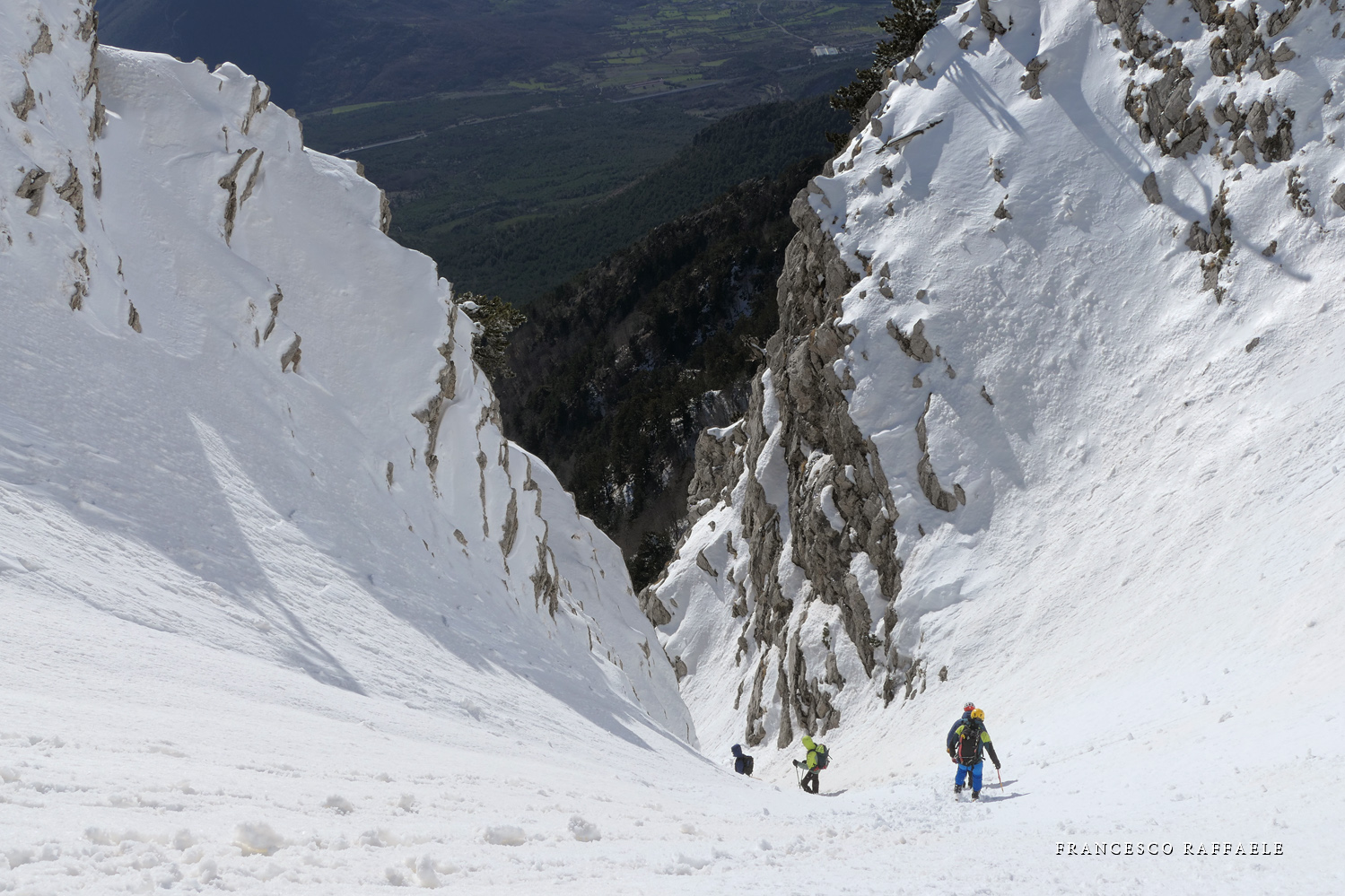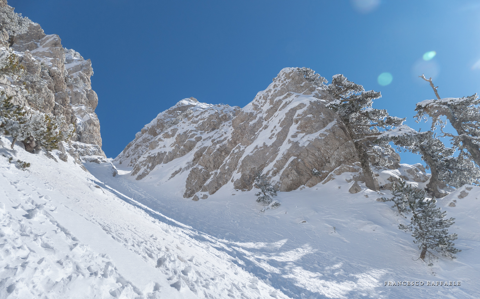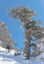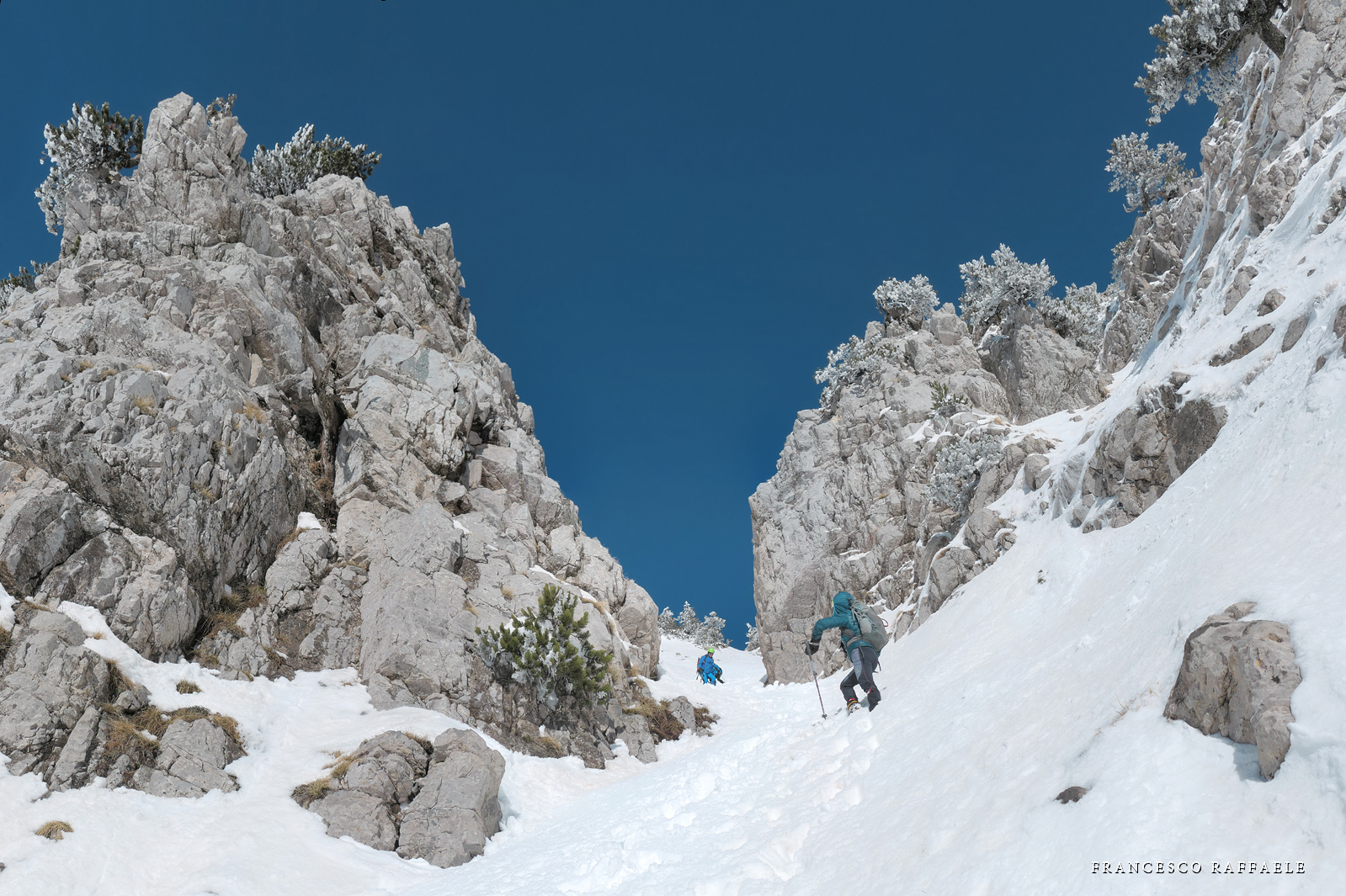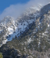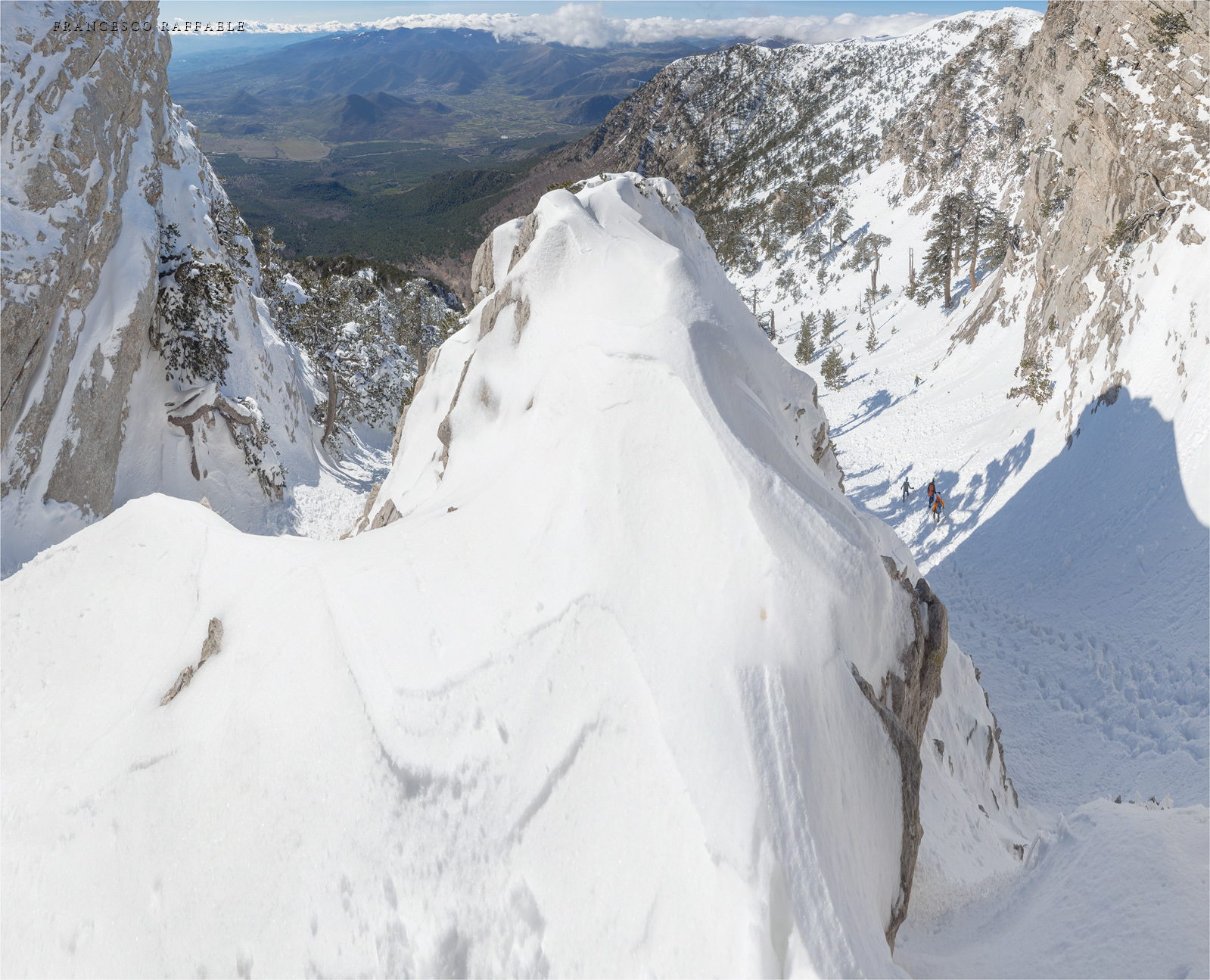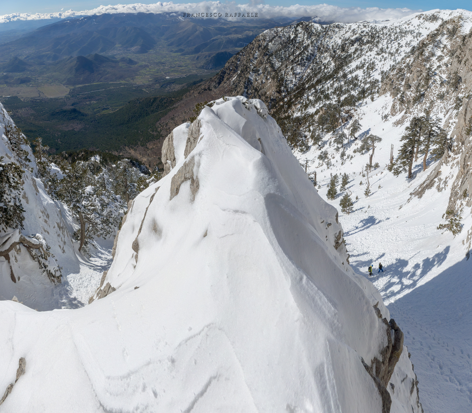 Si sale per la via canonica ma, una volta nella maestosità dell'Anfiteatro SW, da dietro scatta il cambio di programma e si traversa in lieve discesa a S per andare a intercettare la Variante D'Aquila, facile canalino che sbuca da S a metà (o a 1/3) della Direttissima inferiore/di destra o Gola del Turbine. Qui sento Andrea gridare che il pur forte Ercole ha dei problemi sul ghiaccio ripido... alla fine però si svalica e quasi tutti scendiamo nella strettoia della GdT (Ercole invece la risale, per poi riacchiapparci su in cima) e doppiato lo spigolone-prua (q. 2000 m ca) che divide le due direttissime, andiamo a risalire quella classica a sin/N (l'intento era fare una delle varianti più ripide e dirette, ma hanno preso sole e la neve è più molle). In cima non si sta male, anche perché il vento è poco, ben lontano da quello dell'ultimo giro (23/11/2025). Mezz'oretta di sosta panini sotto la cima e si riparte con il mar Ionio e il Sellaro di fronte. Prima dell'ultima anticima E ci caliamo nella Via Luzzo, scorciatoia facile (con questa neve!) e gradita variante rispetto al giro più largo per il Vallone Faggio Grosso. C'è poco da aggiungere se non che: «Entrare qui dentro è sempre un grande privilegio» (M. Ippolito, riferito al canalone della Direttissima), discorso che si può estendere all'intera "gita" da sud al Dolcedorme. E forse il problema di questi tempi moderni è proprio che tecnologie, strade e altre agevolazioni fanno perdere ai più la sensazione e la consapevolezza che giungere sulle montagne equivale sbirciare un po' nelle anticamere dell'Eden o tra le porte del Paradiso, restando avvolti nella bellezza senza tempo che polverizza l'oscena realtà odierna! [13 Km / +1690 m disliv. / 8h 25'] F.R. |
