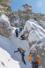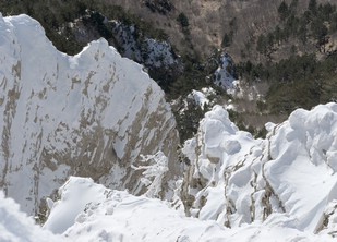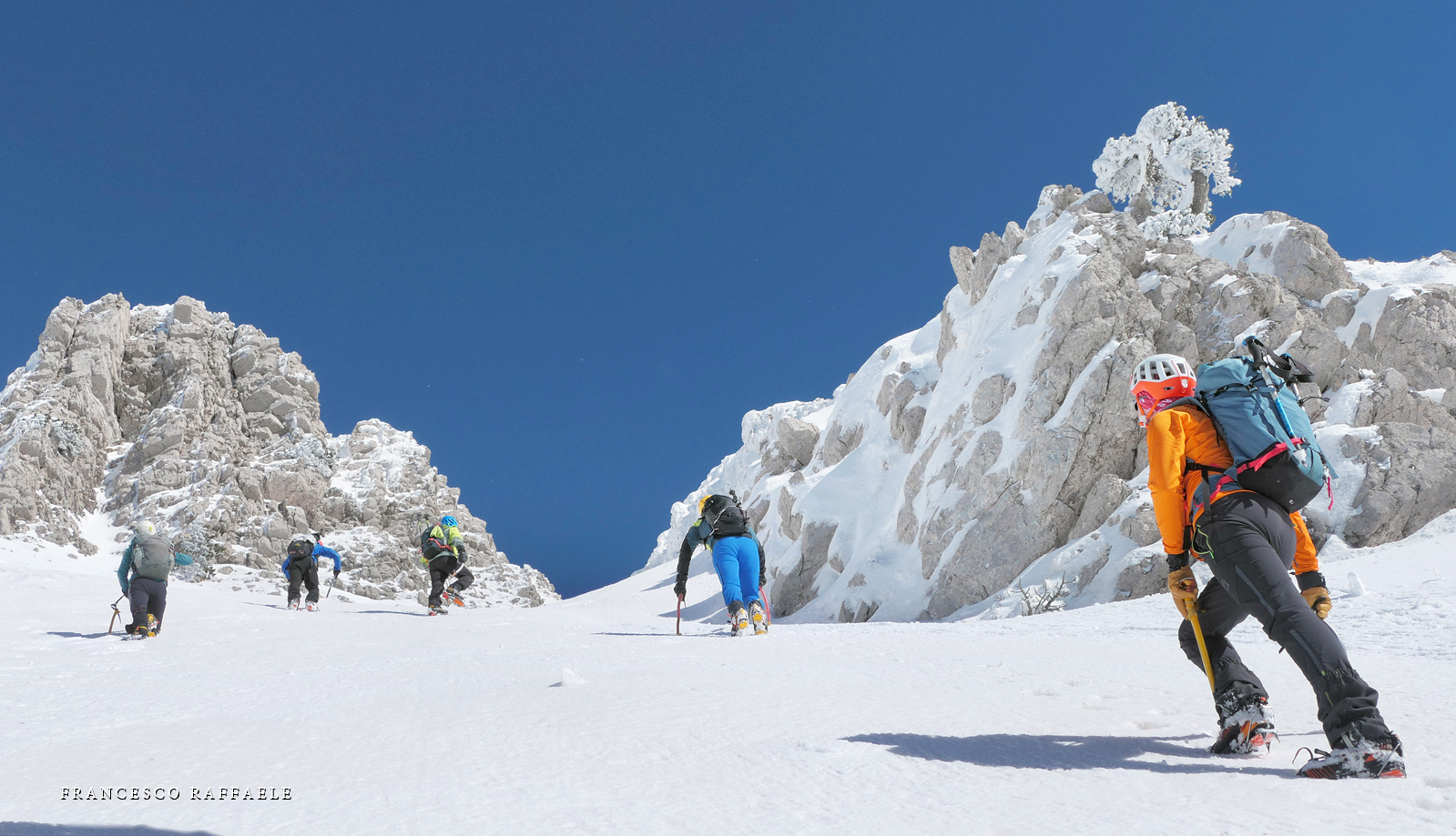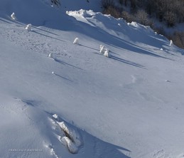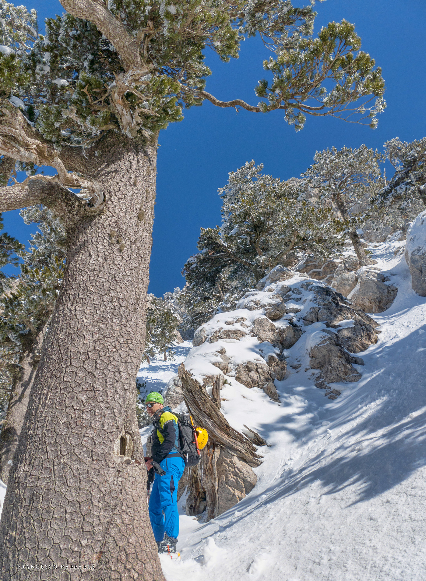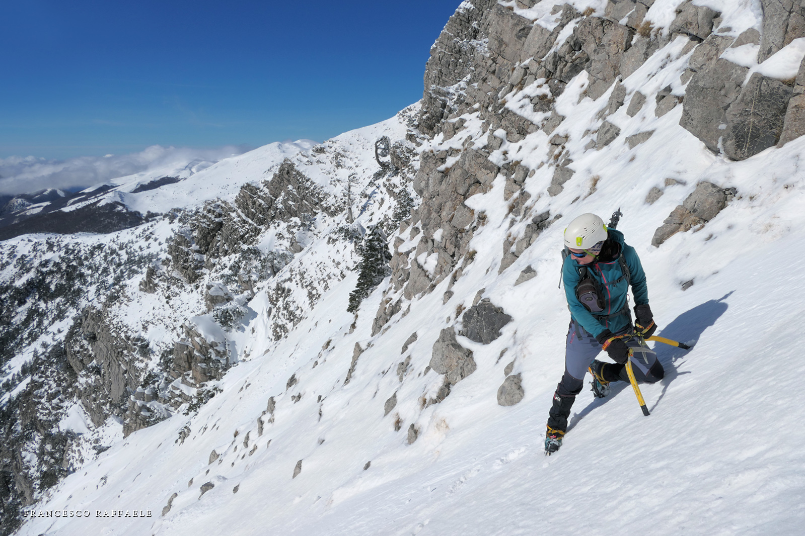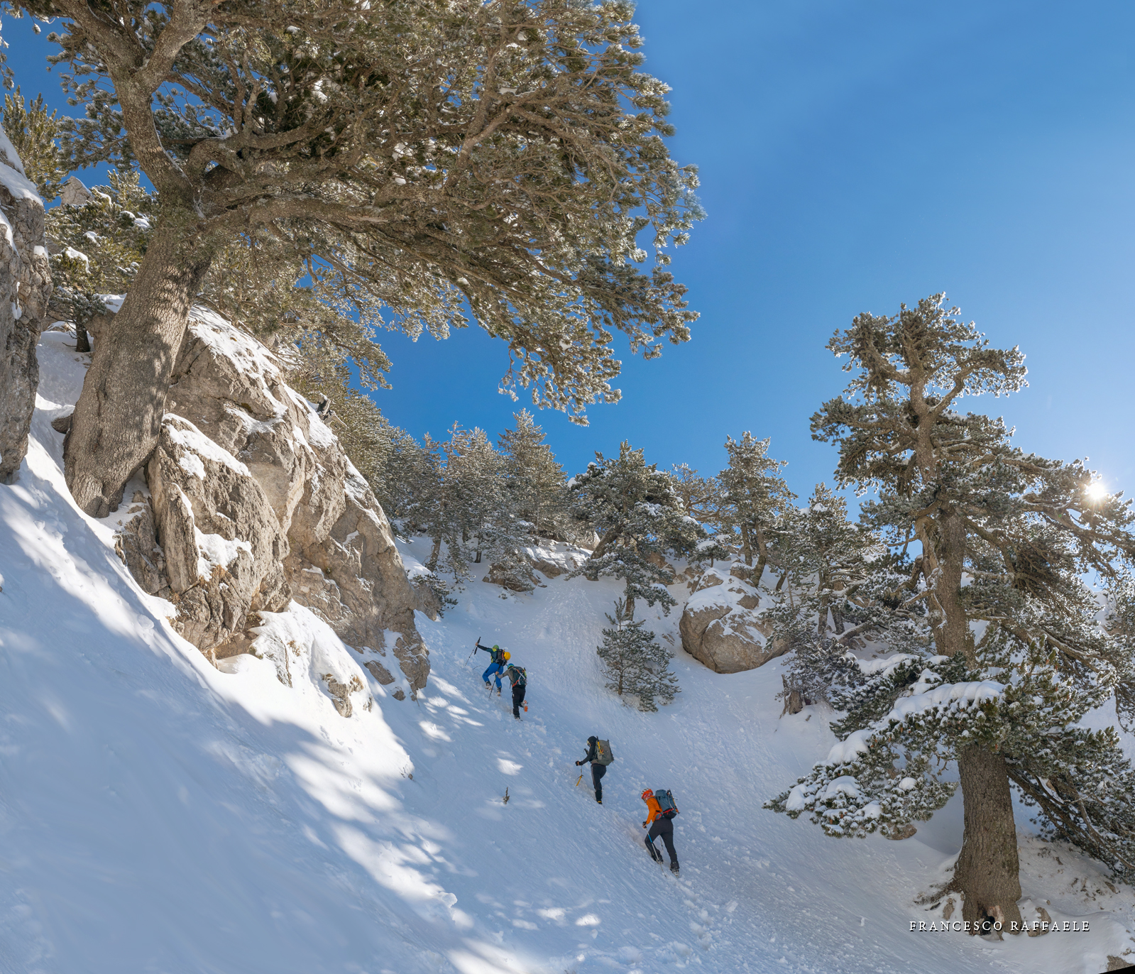 Si sale per la via canonica ma, una volta nella maestosità dell'Anfiteatro SW, da dietro scatta il cambio di programma e si traversa in lieve discesa a S per andare a intercettare la Variante D'Aquila, facile canalino che sbuca da S a metà (o a 1/3) della Direttissima inferiore/di destra o Gola del Turbine. Qui sento Andrea gridare che il pur forte Ercole ha dei problemi sul ghiaccio ripido... alla fine però si svalica e quasi tutti scendiamo nella strettoia della GdT (Ercole invece la risale, per poi riacchiapparci su in cima) e doppiato lo spigolone-prua (q. 2000 m ca) che divide le due direttissime, andiamo a risalire quella classica a sin/N (l'intento era fare una delle varianti più ripide e dirette, ma hanno preso sole e la neve è più molle). In cima non si sta male, anche perché il vento è poco, ben lontano da quello dell'ultimo giro (23/11/2025). Mezz'oretta di sosta panini sotto la cima e si riparte con il mar Ionio e il Sellaro di fronte. Prima dell'ultima anticima E ci caliamo nella Via Luzzo, scorciatoia facile (con questa neve!) e gradita variante rispetto al giro più largo per il Vallone Faggio Grosso. C'è poco da aggiungere se non che: «Entrare qui dentro è sempre un grande privilegio» (M. Ippolito, riferito al canalone della Direttissima), discorso che si può estendere all'intera "gita" da sud al Dolcedorme. E forse il problema di questi tempi moderni è proprio che tecnologie, strade e altre agevolazioni fanno perdere ai più la sensazione e la consapevolezza che giungere sulle montagne equivale sbirciare un po' nelle anticamere dell'Eden o tra le porte del Paradiso, restando avvolti nella bellezza senza tempo che polverizza l'oscena realtà odierna! [13 Km / +1690 m disliv. / 8h 25'] F.R. |