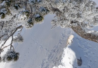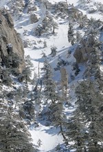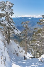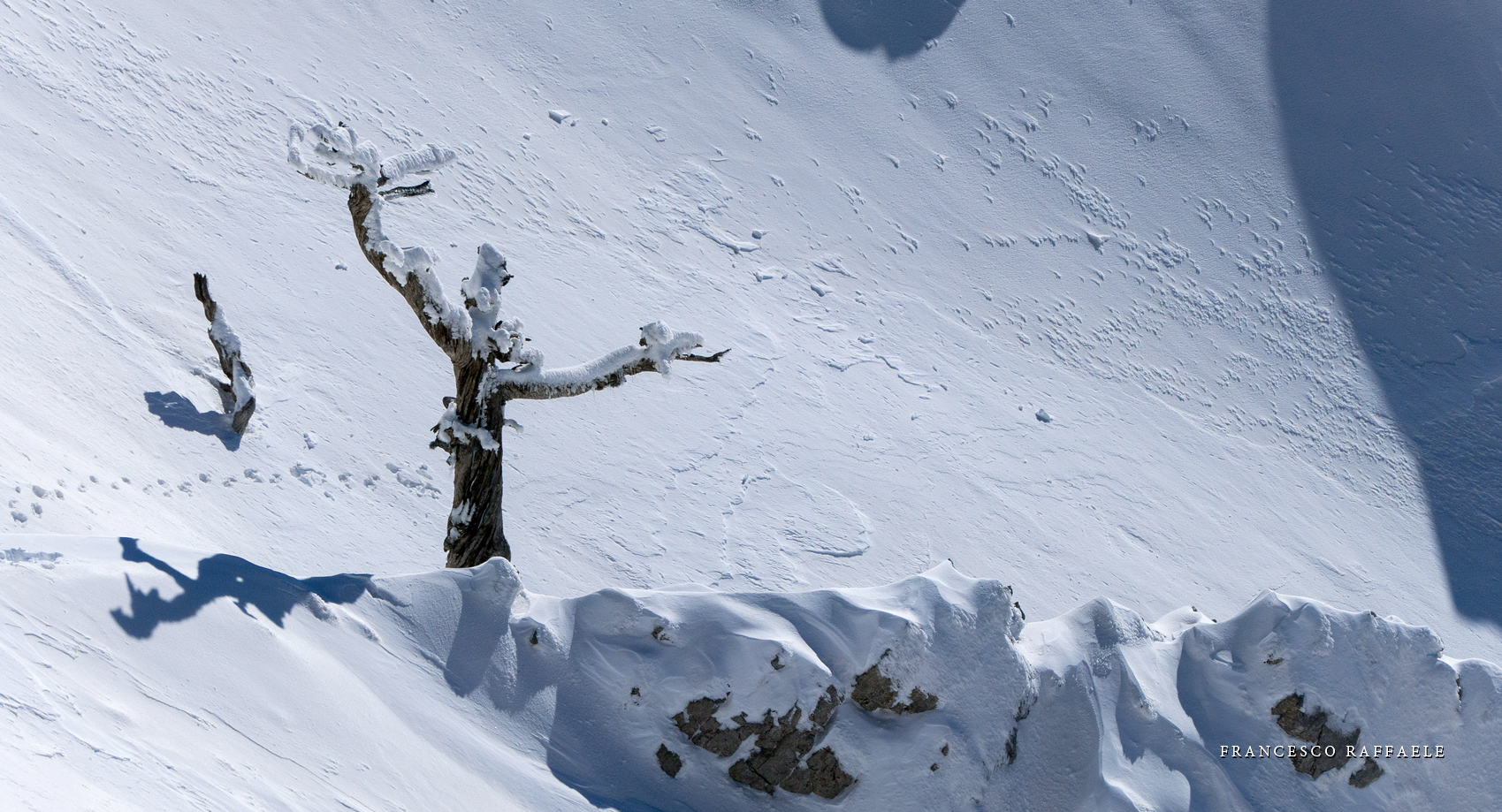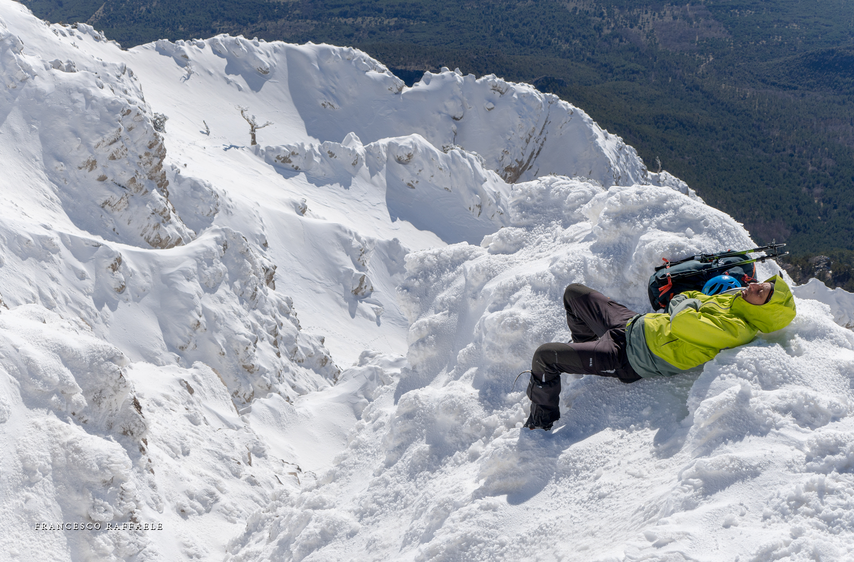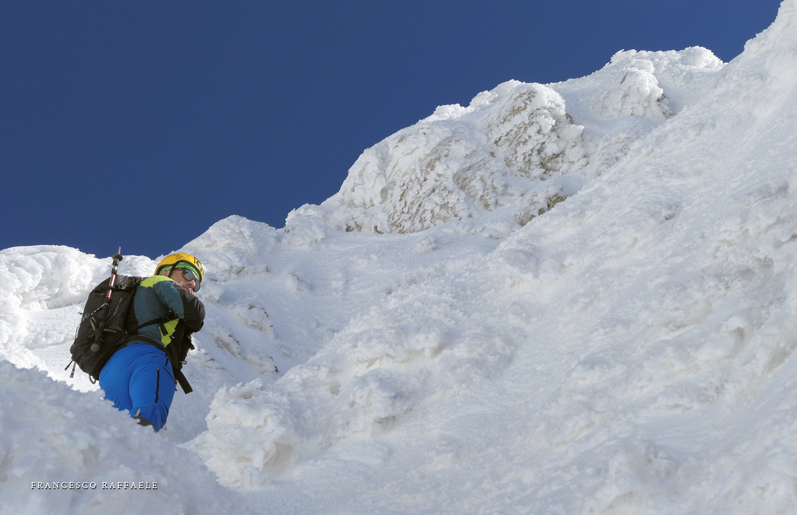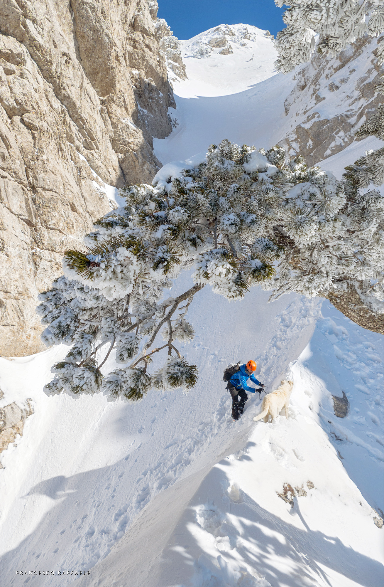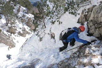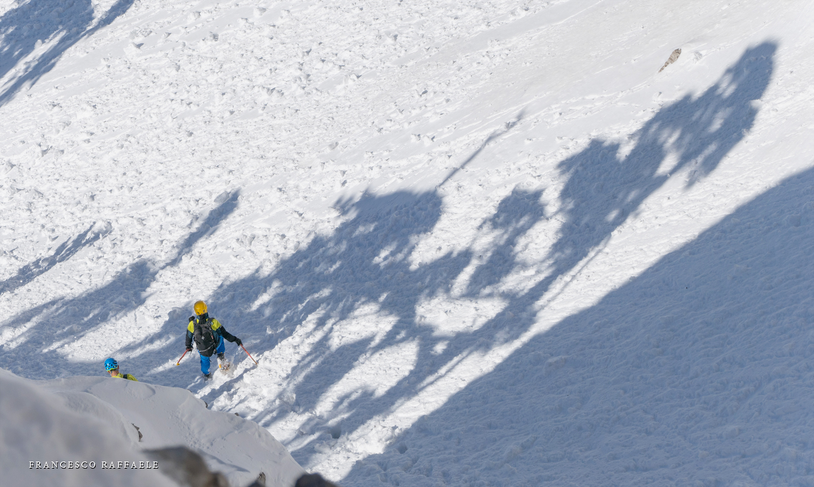 Si sale per la via canonica ma, una volta nella maestosità dell'Anfiteatro SW, da dietro scatta il cambio di programma e si traversa in lieve discesa a S per andare a intercettare la Variante D'Aquila, facile canalino che sbuca da S a metà (o a 1/3) della Direttissima inferiore/di destra o Gola del Turbine. Qui sento Andrea gridare che il pur forte Ercole ha dei problemi sul ghiaccio ripido... alla fine però si svalica e quasi tutti scendiamo nella strettoia della GdT (Ercole invece la risale, per poi riacchiapparci su in cima) e doppiato lo spigolone-prua (q. 2000 m ca) che divide le due direttissime, andiamo a risalire quella classica a sin/N (l'intento era fare una delle varianti più ripide e dirette, ma hanno preso sole e la neve è più molle). In cima non si sta male, anche perché il vento è poco, ben lontano da quello dell'ultimo giro (23/11/2025). Mezz'oretta di sosta panini sotto la cima e si riparte con il mar Ionio e il Sellaro di fronte. Prima dell'ultima anticima E ci caliamo nella Via Luzzo, scorciatoia facile (con questa neve!) e gradita variante rispetto al giro più largo per il Vallone Faggio Grosso. C'è poco da aggiungere se non che: «Entrare qui dentro è sempre un grande privilegio» (M. Ippolito, riferito al canalone della Direttissima), discorso che si può estendere all'intera "gita" da sud al Dolcedorme. E forse il problema di questi tempi moderni è proprio che tecnologie, strade e altre agevolazioni fanno perdere ai più la sensazione e la consapevolezza che giungere sulle montagne equivale sbirciare un po' nelle anticamere dell'Eden o tra le porte del Paradiso, restando avvolti nella bellezza senza tempo che polverizza l'oscena realtà odierna! [13 Km / +1690 m disliv. / 8h 25'] F.R. |