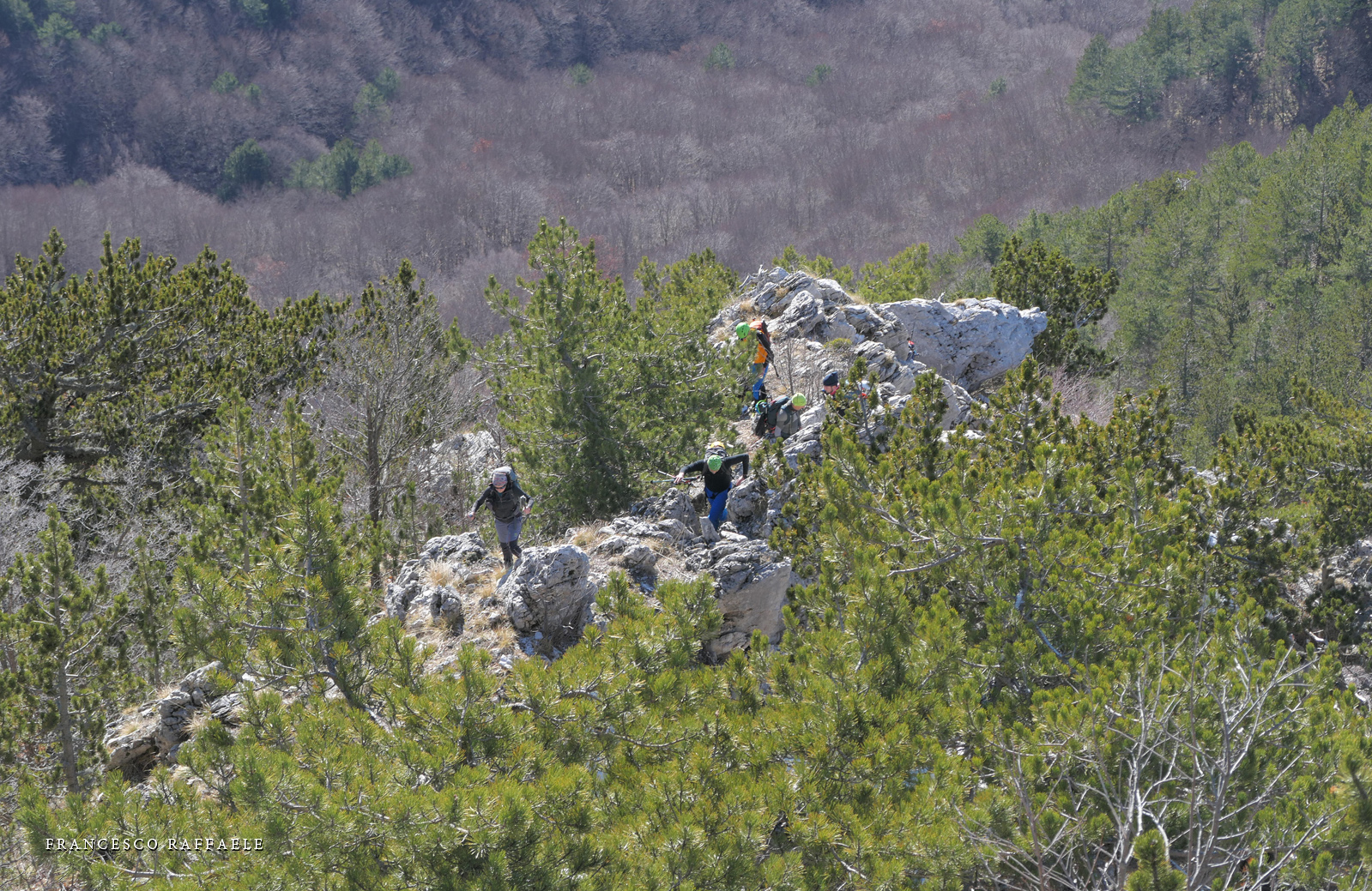 Le mie, di condizioni, sono spesso un'incognita (anche se da quest'estate non posso lamentarmi) e allora parto a razzo sicuro che poi gli altri 8 mi raggiungerano e supereranno prima del Passo di Valle Cupa, poiché abbiamo deciso di salire per il Crestone. E invece tengo bene, e in 75 min sono lì, e ci compattiamo; altri 10 min e si riparte sui più ripidi pendii e con qualche facile arrampicata lungo il panoramico Crestone dei Loricati. Stesso discorso di prima, immagino che gli altri mi supereranno nel giro di qualche decina di minuti, ma in 1 ora sono al Campo Base (non ci avevo mai messo meno di 2 h e mezzo: so che si può fare in molto meno ma non è che vado per record è che mi rallegra constatare che non sto ancora nella fase calante e che i giorni o periodi di fuori-forma sono ciclici). Intanto arriva il cane Ercole e in 9, lui incluso, facciamo una piccola riunione sul prosieguo: verso destra per il "Dente" (il cane non so come se la caverebbe lì) o solita "Direttissima"?